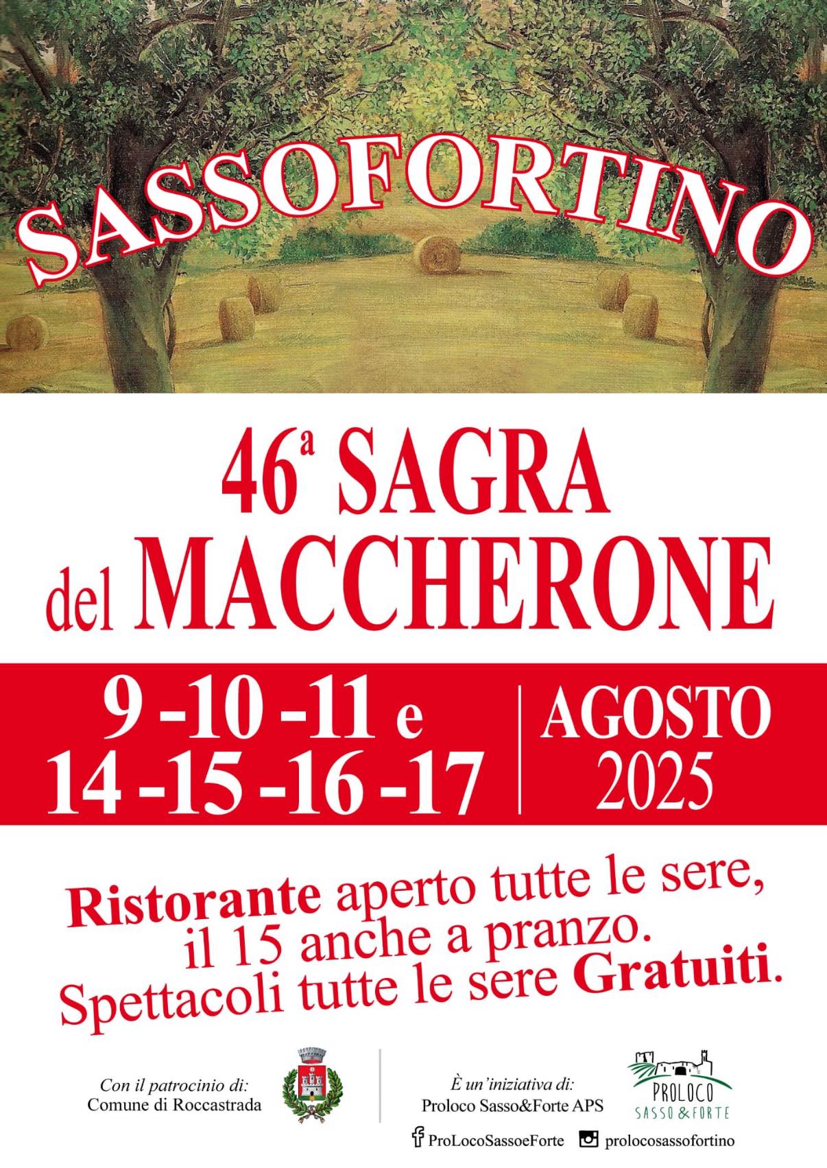 Nei giorni 9-10-11 e 14-15-16 e agosto, la Pro Loco Sasso&Forte organizza al Parco Fonte di Vandro di Sassofortino, la 46° sagra del maccherone, con il patrocinio del Comune di Roccastrada.