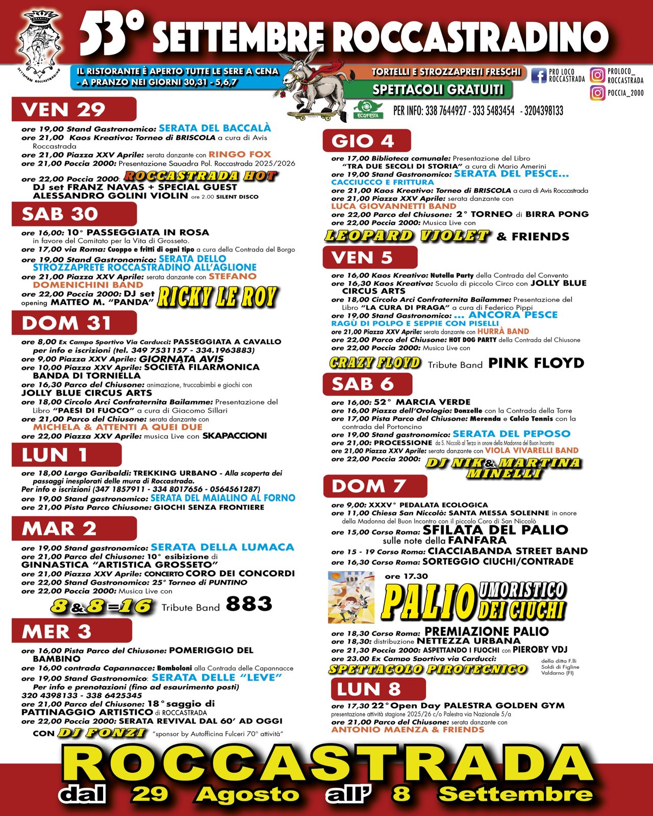 Roccastrada si prepara ad accogliere la 53esima edizione del Settembre Roccastradino con dieci giorni di tradizioni, sport, sapori tipici e animazione da venerdì 29 agosto a lunedi 8 settembre.