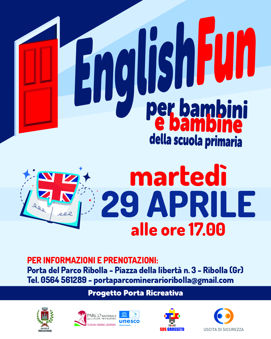 Alla Porta del Parco di Ribolla, un progetto a cura della Porta Ricreativa, martedi 29 aprile alle ore 17.00 "English Fun" laboratorio di inglese per bambini e bambine della scuola primaria.
