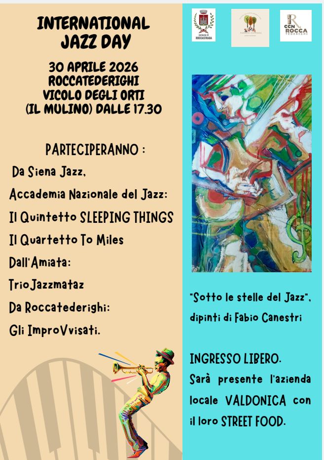 L'associazione Paesaggi Culturali, in occasione della Giornata Internazionale del Jazz che si celebra il 30 aprile di ogni anno, dopo la positiva esperienza dello scorso anno, che in un solo giorno, riuscì a riunire 8 musicisti per un’esibizione davanti ad un folto pubblico, quest’anno rilancia e ripete l’esperienza con un numero maggiore di artisti di livello nazionale ed internazionale nel borgo di Roccatederighi.