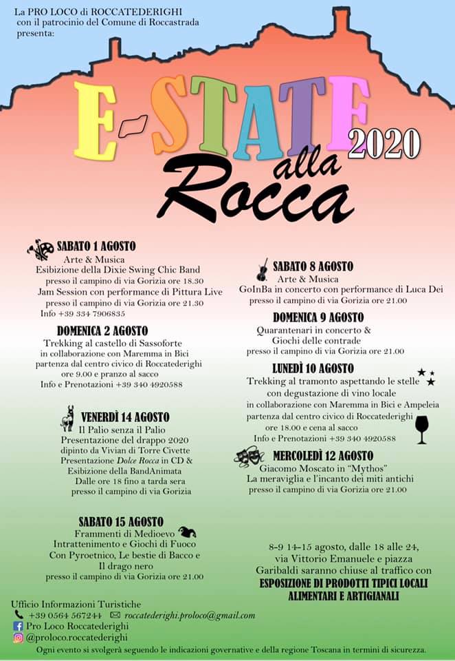 La Pro Loco Roccatederighi con il patrocinio del Comune di Roccastrada, organizza una serie di eventi dal 1 al 15 agosto tra arte e musica, intrattenimento e passeggiate ed una esposizione di prodotti tipici locali, alimentari ed artigianali