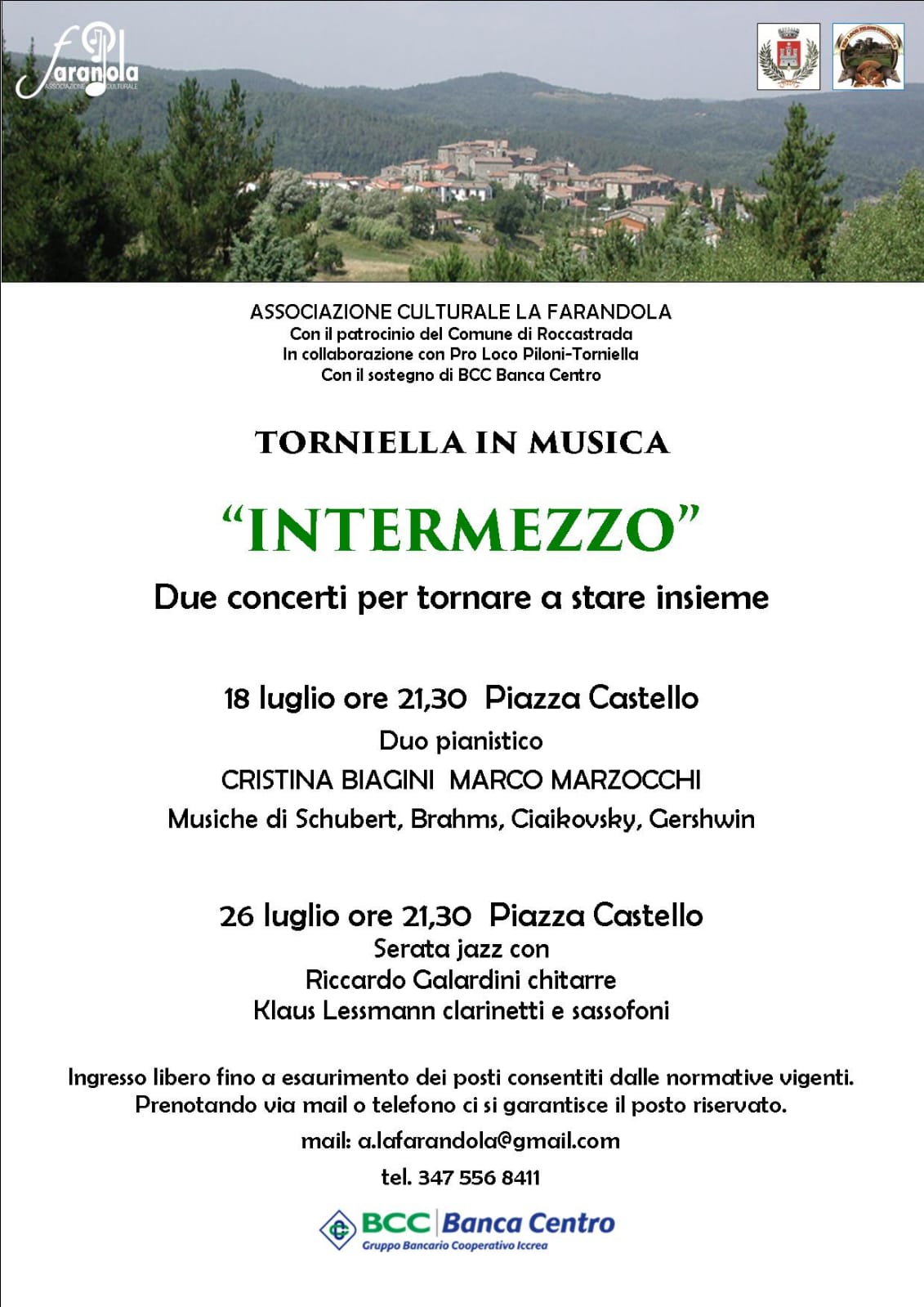 Ma l’Associazione Culturale “La Farandola”, promotrice della manifestazione, con il patrocinio del comune di Roccastrada e la collaborazione della proloco Piloni Torniella, per dare un segno di continuità a questo evento e un messaggio di rinascita e ottimismo, sarà comunque presente a Torniella con 2 prestigiosi concerti: quello del 18 luglio tenuto dal Duo pianistico Cristina Biagini - Marco Marzocchi, che vanta un curriculum di prestigio Internazionale, essendosi esibito in importanti festival in tutto il mondo. In programma musiche di Schubert Brahams Tchaikovsky e Gershwin, di cui verrà eseguita la famosissima Rapsodia in blu. Il 26 luglio sarà ’la volta del duo jazz chitarra e sassofono di Riccardo Galardini e Klaus Lessmann, noti musicisti attivi sul territorio che vantano solide e significative esperienze artistiche in campo nazionale e internazionale.