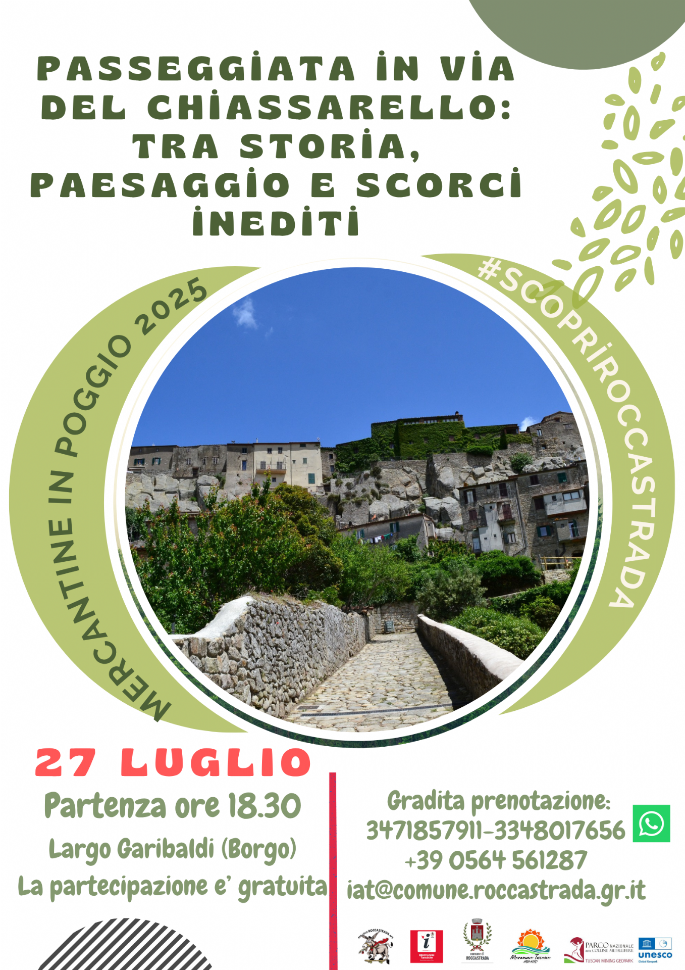 L'Ufficio Informazioni ed Accoglienza Turistica di Roccastrada organizza per domenica 27 luglio una passeggiata in via del Chiassarello, dopo la sua recente riqualificazione. La partenza è fissata per le ore 18.30 da Largo Garibaldi.