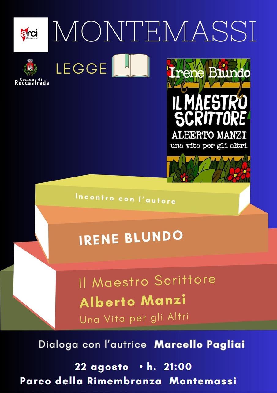 Venerdì 22 agosto alle ore 21.00, sotto i lecci del Parco della Madonna a Montemassi, nell’ambito del cartellone degli eventi estivi organizzato dal Circolo Arci Montemassi con il patrocinio del Comune di Roccastrada, si terrà la presentazione del libro di Irene Blundo “Il maestro scrittore Alberto Manzi: una vita per gli altri”. L’autrice parlerà del suo libro dialogando con Marcello Pagliai.