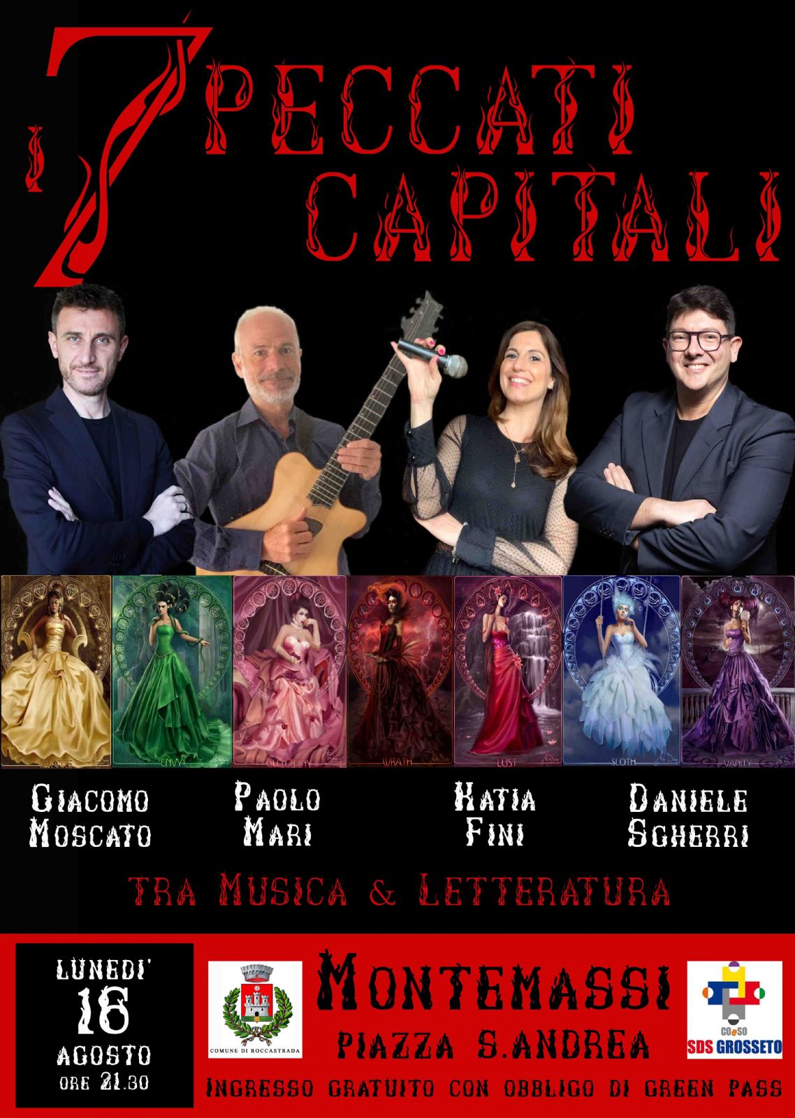 Il Comune di Roccastrada organizza in Piazza S.Andrea a Montemassi Lunedi 16 agosto alle ore 21.30 lo spettacolo "I 7 peccati capitali" tra Musica & Letteratura, con Daniele Sgherri, Giacomo Moscato, Katia Fini e Paolo Mari.