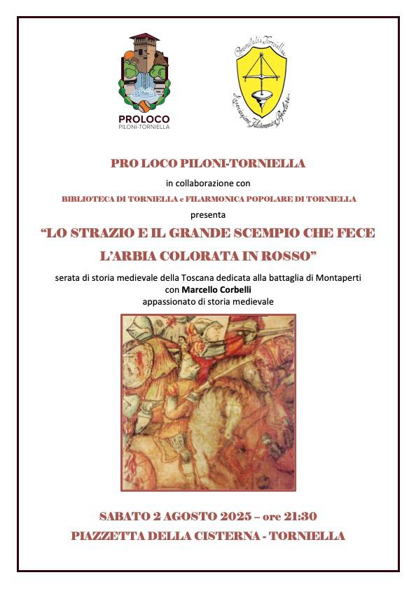 La Pro Loco Piloni-Torniella in collaborazione con la Biblioteca di Torniella e la Filarmonica popolare di Torniella presentano sabato 2 agosto alle ore 21.30 in piazzetta della cisterna a Torniella: "Lo strazio e il grande scempio che fece l'Arbia colorata in rosso", serata di storia medievale della Toscana dedicata alla battaglia di Montaperti con Marcello Corbelli appassionato di storia medievale.