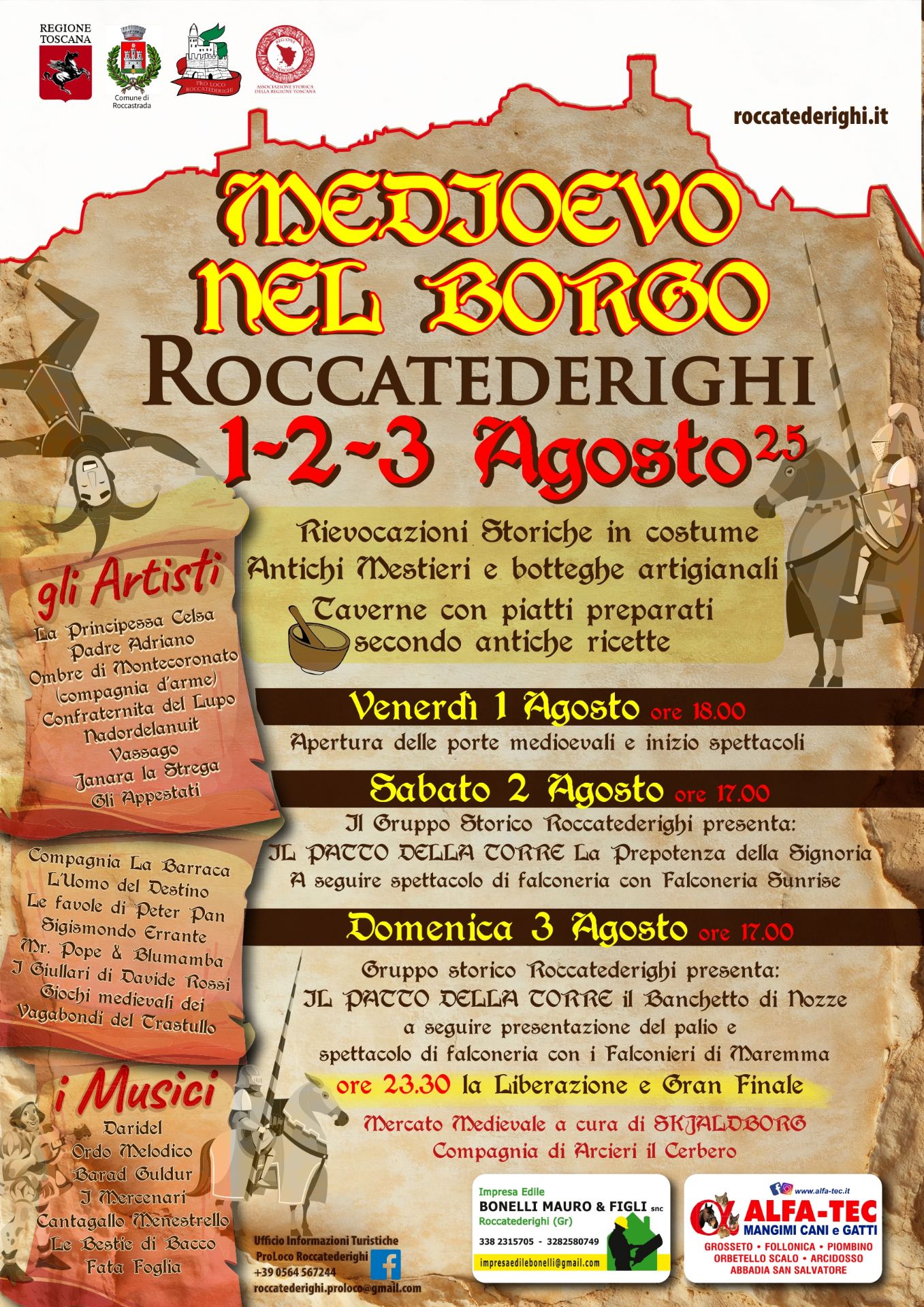 - domenica 3 agosto alle ore 17,00 il gruppo storico di Roccatederighi presenta "Il patto della Torre: il Banchetto di nozze". A seguire presentazione del palio e spettacolo di falconeria con I Falconieri di Maremma. Alle ore 23,30 La Liberazione e il Gran Finale.