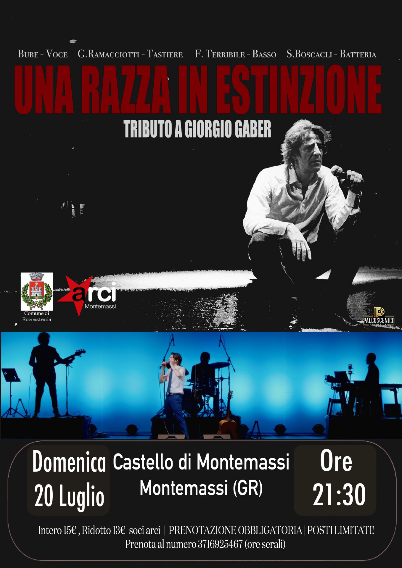 Sta riscuotendo un grande successo l’evento “Una Razza in Estinzione – Il Grande Tributo a Gaber”, in programma domenica 20 luglio alle ore 21.30 al castello di Montemassi. E’ un’occasione imperdibile per chi vuole assistere a una serata emozionante dedicata al genio di Giorgio Gaber in un’atmosfera inedita che si manifesterà nell’incantevole location del Castello di Montemassi.