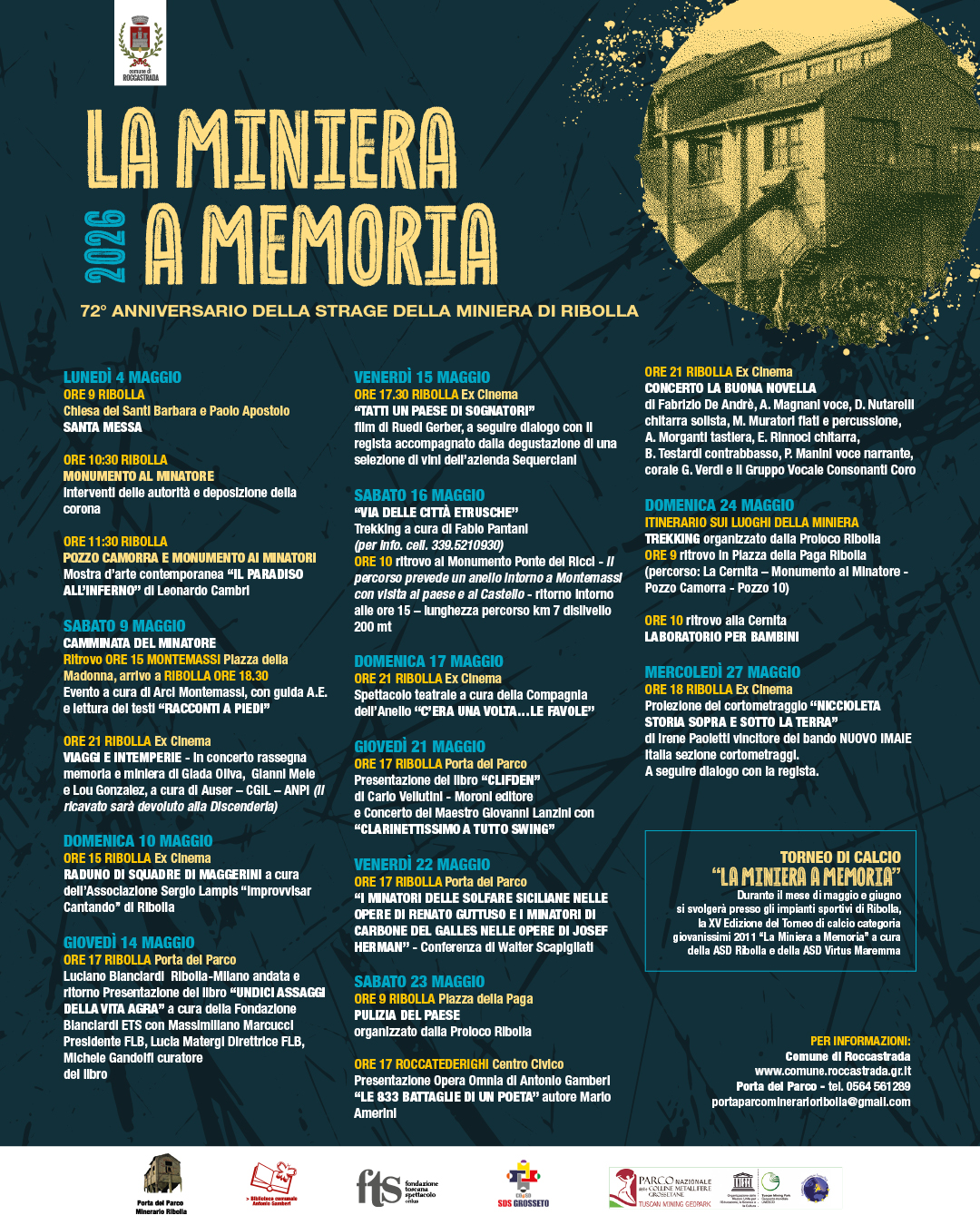 Informazioni. Per ulteriori informazioni sul cartellone “La miniera a memoria” è possibile contattare il Comune di Roccastrada al numero 0564-561243, oppure la Porta del Parco di Ribolla al n. 0564-561289 ed e-mail: portaparcominerarioribolla@gmail.com.