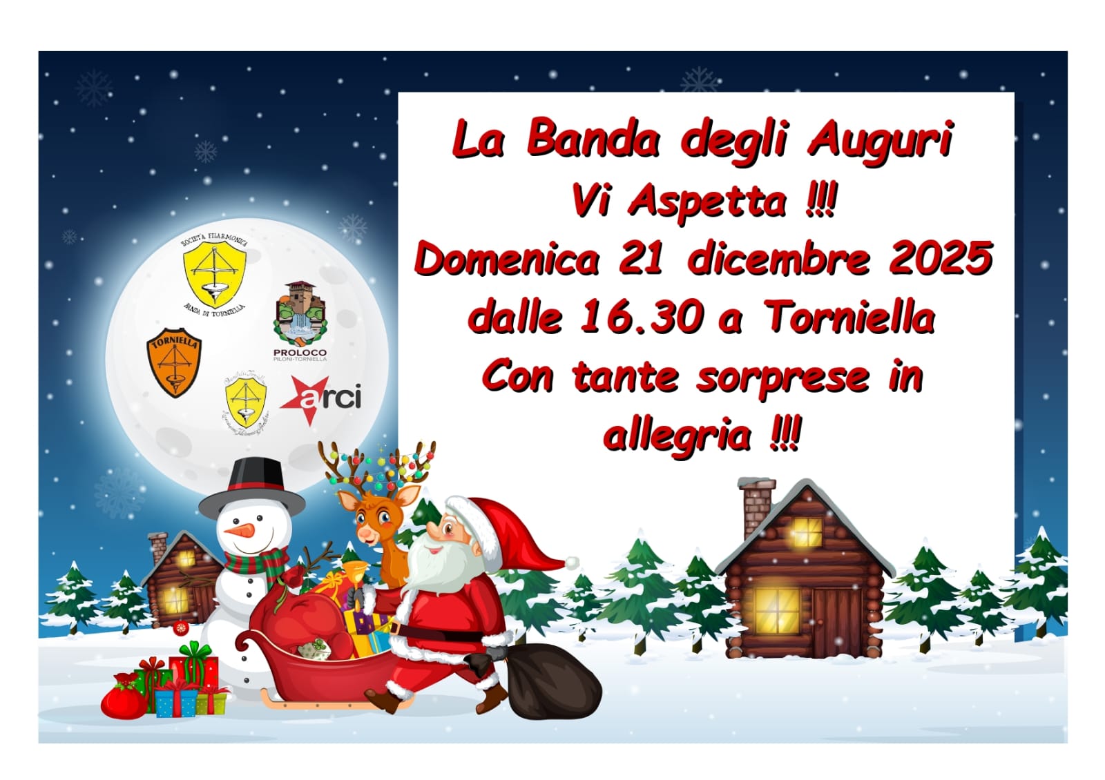 La Banda di Torniella organizza per domenica 21 dicembre dalle ore 16.30 a Torniella il pomeriggio degli auguri con tante sorprese ai presenti.
