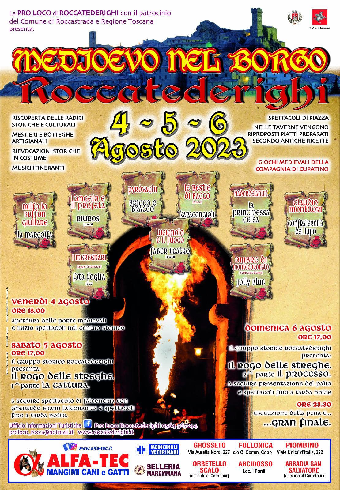 domenica 6 agosto ore 17, il gruppo storico di Roccatederighi presenta "Il rogo delle streghe" - 2° parte Il Processo a seguire presentazione del palio e spettacoli fino a tarda notte. ore 23.30 esecuzione della pena e gran finale