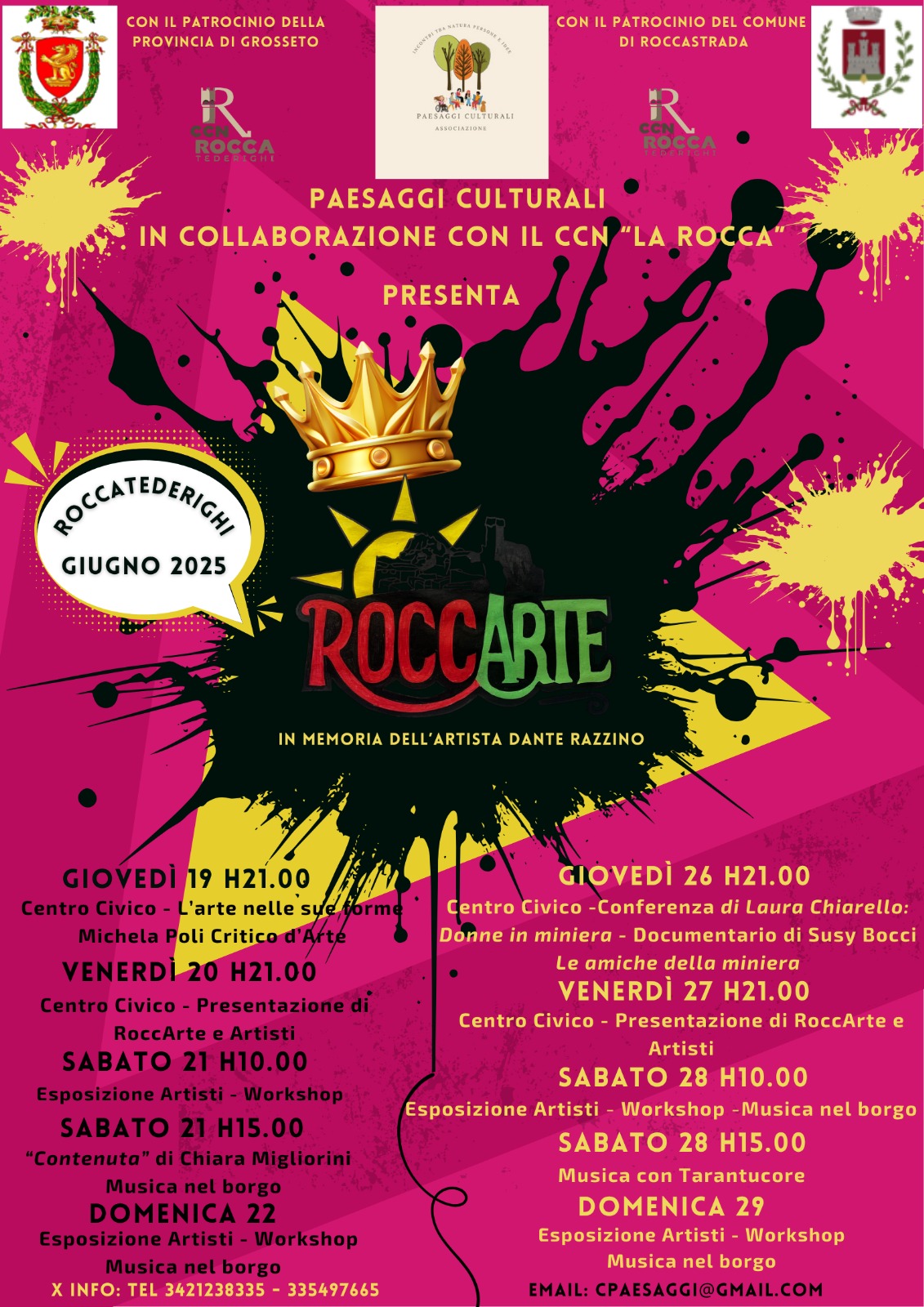 Prende il via giovedi 19 giugno a Roccatederighi, la rassegna culturale RoccArte, organizzata dalla neo costituita “Associazione Paesaggi Culturali APS ARCI” in memoria di Dante Razzino, che interesserà vari spazi ed aree nel centro storico del borgo.