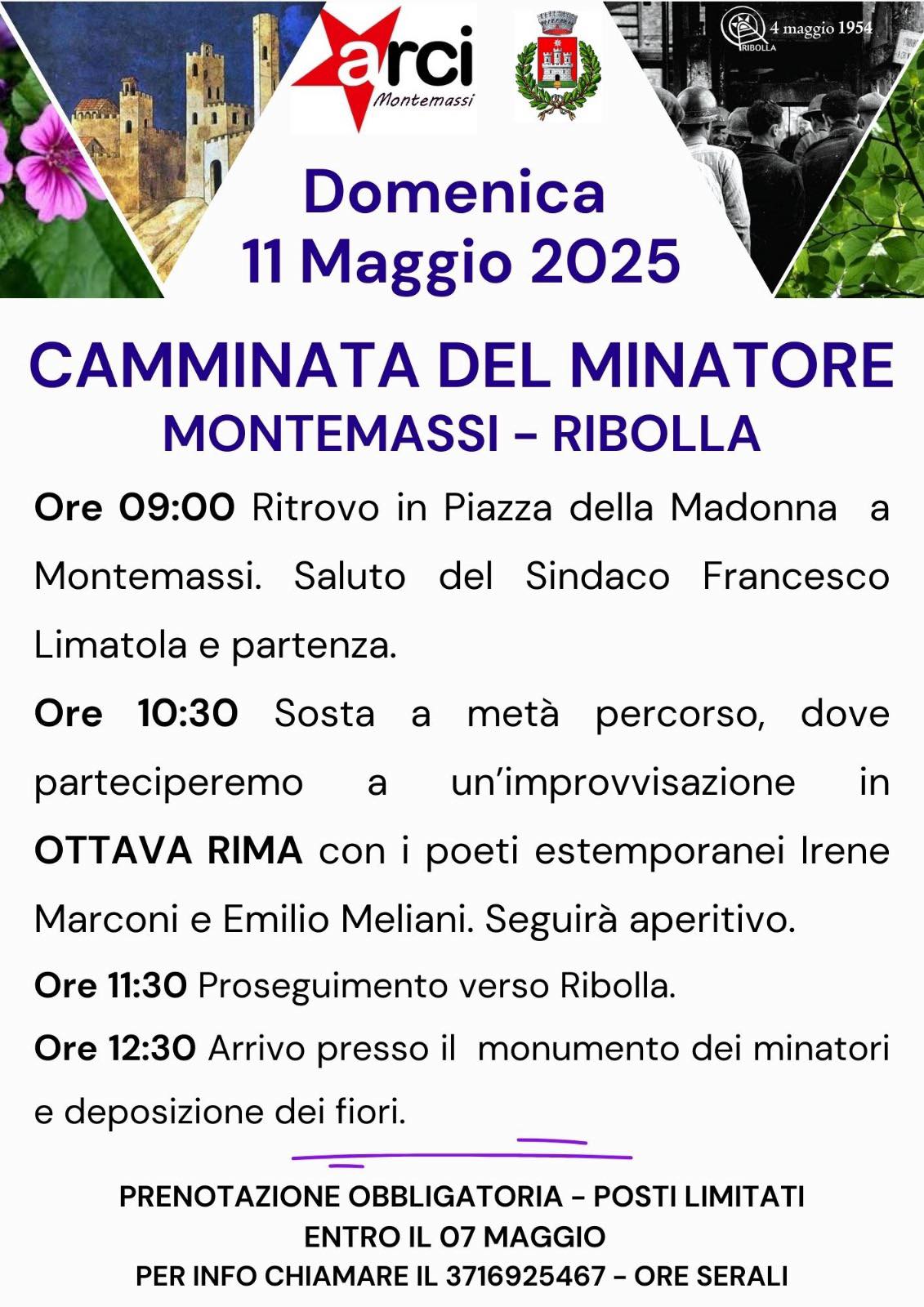 Nell’ambito della Rassegna “La Miniera a memoria” che tradizionalmente prevede l’organizzazione di una serie di eventi in ricordo della tragedia mineraria di Ribolla del 4 maggio 1954 giunta quest’anno al 71° anniversario, il Comune di Roccastrada organizza in collaborazione con ARCI Montemassi la tradizionale “Camminata del minatore” che si terrà domenica 11 maggio con incontro e partenza alle ore 09:00 in piazza della Madonna a Montemassi.
