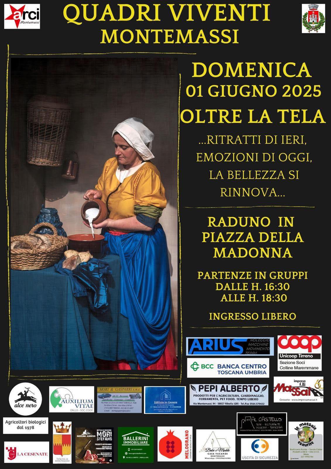 Domenica 1 giugno il paese tornerà ad essere un museo a cielo aperto, dando vita a decine di quadri, tra le piazze, le vie, gli scorci e i panorami di Montemassi. Si terrà infatti la dodicesima edizione del tradizionale appuntamento con I Quadri Viventi dal tema “Oltre la tela … ritratti di ieri, emozioni di oggi, la bellezza si rinnova”, uno spettacolo unico che vede impegnati circa cento persone tra figuranti, carpentieri, falegnami, elettricisti, costumisti, parrucchieri, truccatori, appassionati di arti figurative, e tanti altri che daranno vita a stupendi allestimenti scenografici che contribuiranno alla realizzazione dell’evento come sempre, in forma del tutto gratuita.