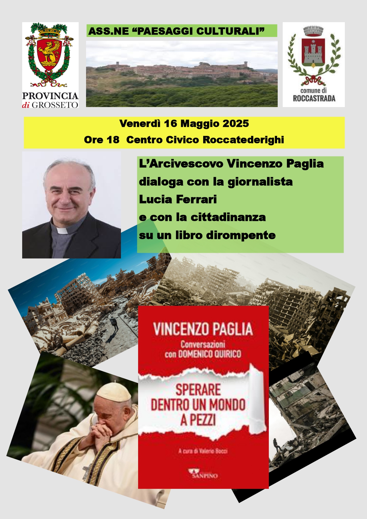 Appuntamento per venerdi 16 maggio alle ore 18.00 al Centro Civico di Roccatederighi dove l’Associazione Paesaggi Culturali con il patrocinio del Comune di Roccastrada e della Provincia di Grosseto, organizza un incontro con Monsignor Paglia che dialogherà con la giornalista RAI Lucia Ferrari commentando il libro “Sperare dentro un mondo a pezzi” che raccoglie le conversazioni tra il monsignore e l’inviato di guerra Domenico Quirico.