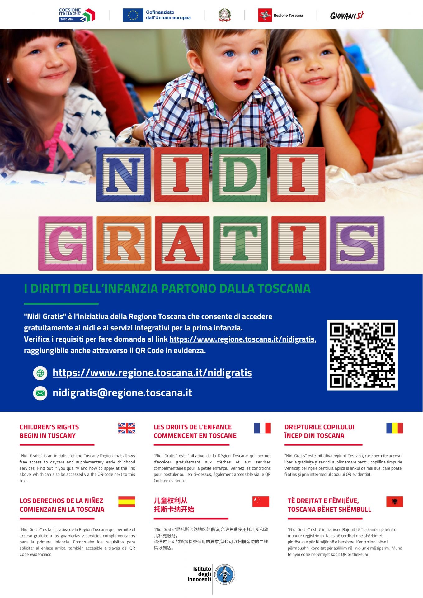 Anche per quest’anno, Regione Toscana sostiene la misura "Nidi Gratis” per consentire ai bambini e alle bambine fino a 3 anni di età di accedere gratuitamente ai nidi e agli altri servizi educativi per la prima infanzia e sta promuovendo, in accordo con l’Istituto degli Innocenti, una campagna di comunicazione per darne massima diffusione anche attraverso la collaborazione di Anci Toscana.