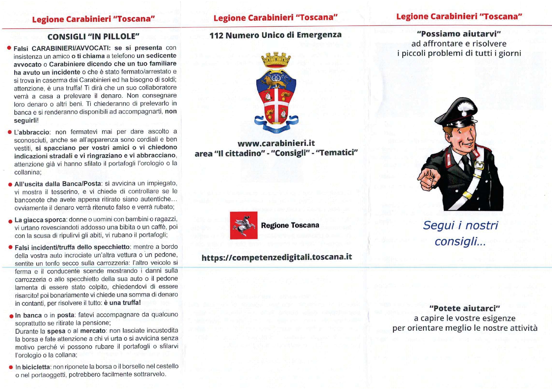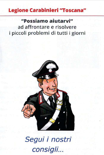 In considerazione dell'aumento dei tentativi di truffa, furti e raggiri alle persone anziani o deboli che si stanno verificando con sempre più frequenza nell'ultimo periodo anche nelle nostre zone, la Legione Carabinieri "Toscana" ha diffuso un utile vademecum per cercare di scongiurare questo tipo di eventi.