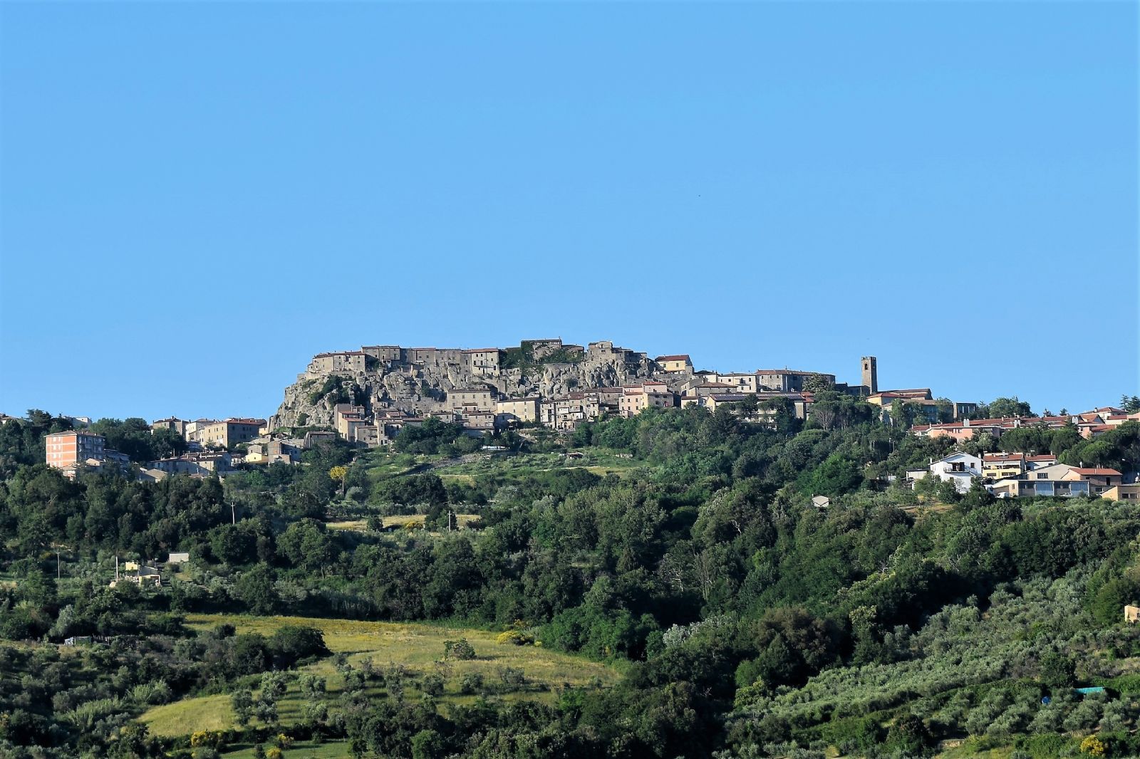 Il centro storico si svolge lungo il crinale di una "terrazza" di roccia riolitica dove le modeste abitazioni del borgo convergono verso le "carceri", vecchio centro politico dell'antico castello.Niente resta delle antiche difese e della rocca ad eccezione di un tratto delle mura, a levante, sul quale sono state alzate le case. A ponente probabilmente non sono mai state opere di difesa significative, per la presenza di una parete di roccia a strapiombo spaccata in giganteschi massi. Nel vecchio paese le abitazioni patrizie conservano bei particolari decorativi scalpellati nella pietra locale tra cui camini, portali, finestre ad edicola. L’uso della trachite è stato recentemente riprodotto nelle opere di due scultori francesi, interpreti della vecchia tradizione degli scalpellini. Nel lavoro di Renaux François detto Jules, posto all’entrata del centro storico a partire dalla principale piazza Gramsci, si affronta il tema del rapporto tra presente e passato, costruendo un monolite scolpito le cui facce poste al vertice, l’una di un bambino e l’altra di un vecchio, sono rivolte in direzione opposte e sono separate da un disco di pietra rappresentante il divenire del tempo, secondo i canoni mitologici dei Limes Romani. In quello di Vincenzo Du Bois, le due pietre simboleggianti le due anime che caratterizzano urbanisticamente il nostro territorio, quella medievale e quella moderna, due epoche, formano però un tutto unico. Un blocco di trachite spaccato in due lascia intravedere due fossili, uno per ciascuna pietra, fratelli ma nemici; il primo fossile rappresenta una foglia come impronta della natura, l’altro una mano umana, a rappresentare la dualità perenne tra uomo e natura, tra civilizzazione e ambiente.
