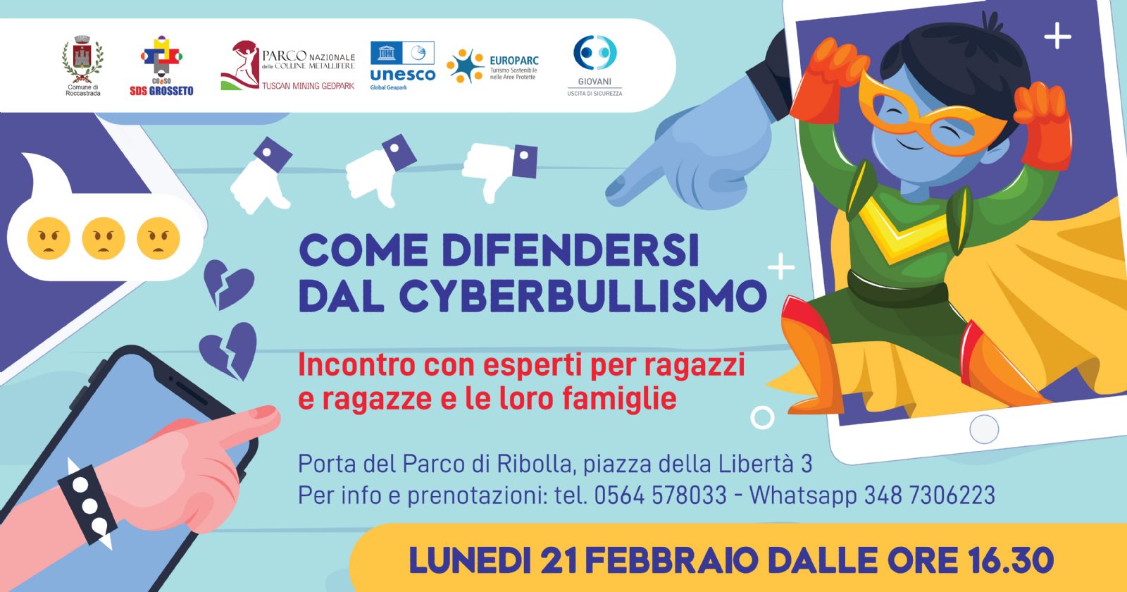 Come difendersi dal cyberbullismo? Le famiglie del Comune di Roccastrada potranno avere informazioni utili partecipando all’evento in programma lunedì 21 febbraio alle 16.30 nei locali della Porta del Parco, in piazza Libertà 3, con l’evento promosso dal Comune di Roccastrada, in collaborazione con il Coeso, il Parco nazionale delle Colline Metallifere e la cooperativa Uscita di Sicurezza, che anima il centro di aggregazione nell’ex cinema.