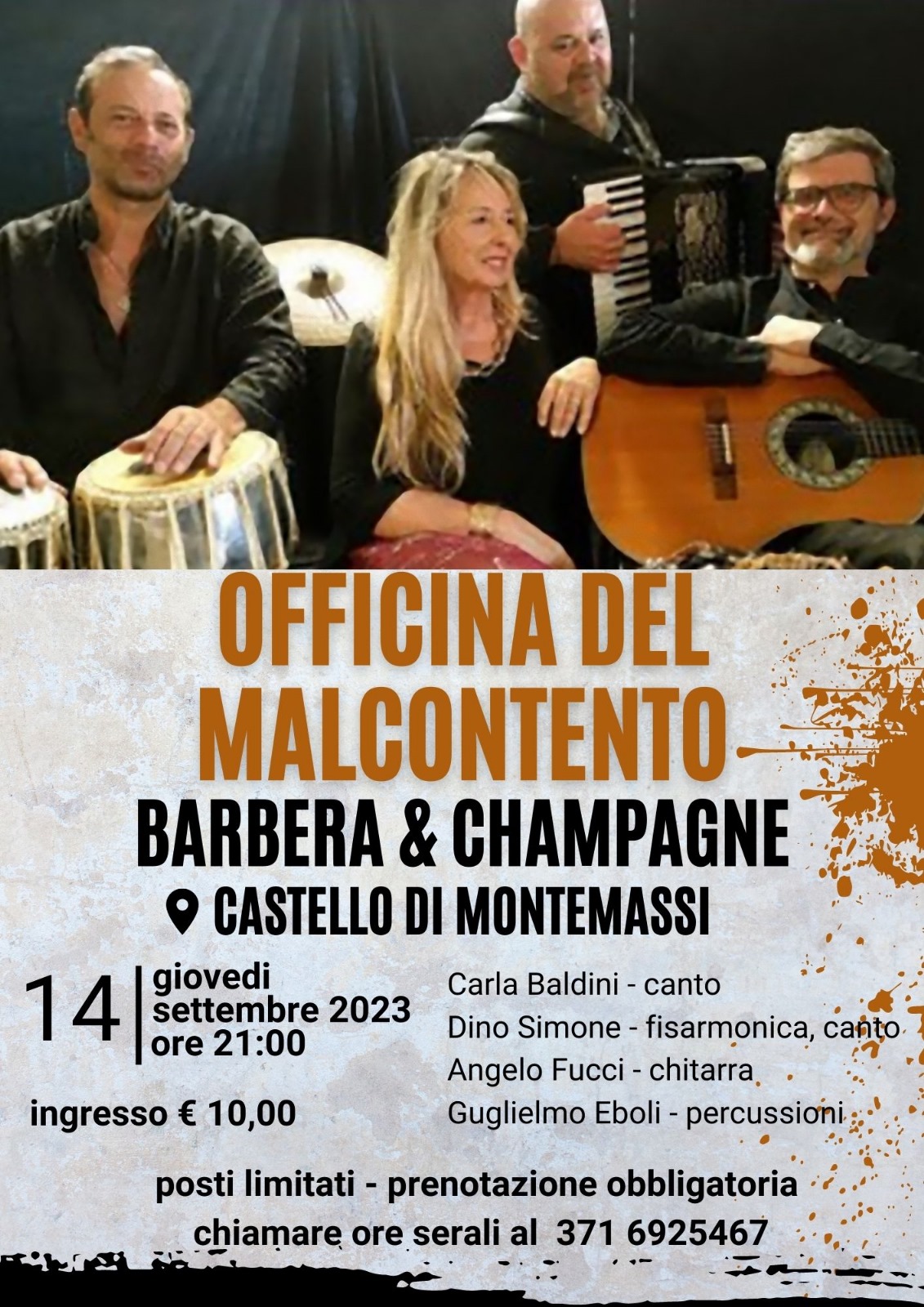 Si esibirà il gruppo “Officina del Malcontento” con lo spettacolo “Barbera & Champagne”, un concerto che, come suggerisce il titolo, esprime le due anime del gruppo: quella popolare (musica della tradizione regionale italiana, dalla Toscana alla Puglia, dalla Sicilia alla Sardegna) e quella autoriale e cantautoriale (canzoni d’autore italiane e internazionali e alcuni originali di Carla Baldini e Dino Simone). Da “Sur le ciel de Paris” di Edith Piaf a “La folla”, cavallo di battaglia di Milva, da “Barbera & Champagne” di Giorgio Gaber a “Solo me ne vo per la città” di Natalino Otto, dalla pizzica salentina “Kalinifta” all’inno all’amore “No potho reposare” reso celebre da Maria Carta e Andrea Parodi, per finire con i brani originali di Carla Baldini e Dino Simone, come “Flagellanti” e “Samba du scojonamentu”.