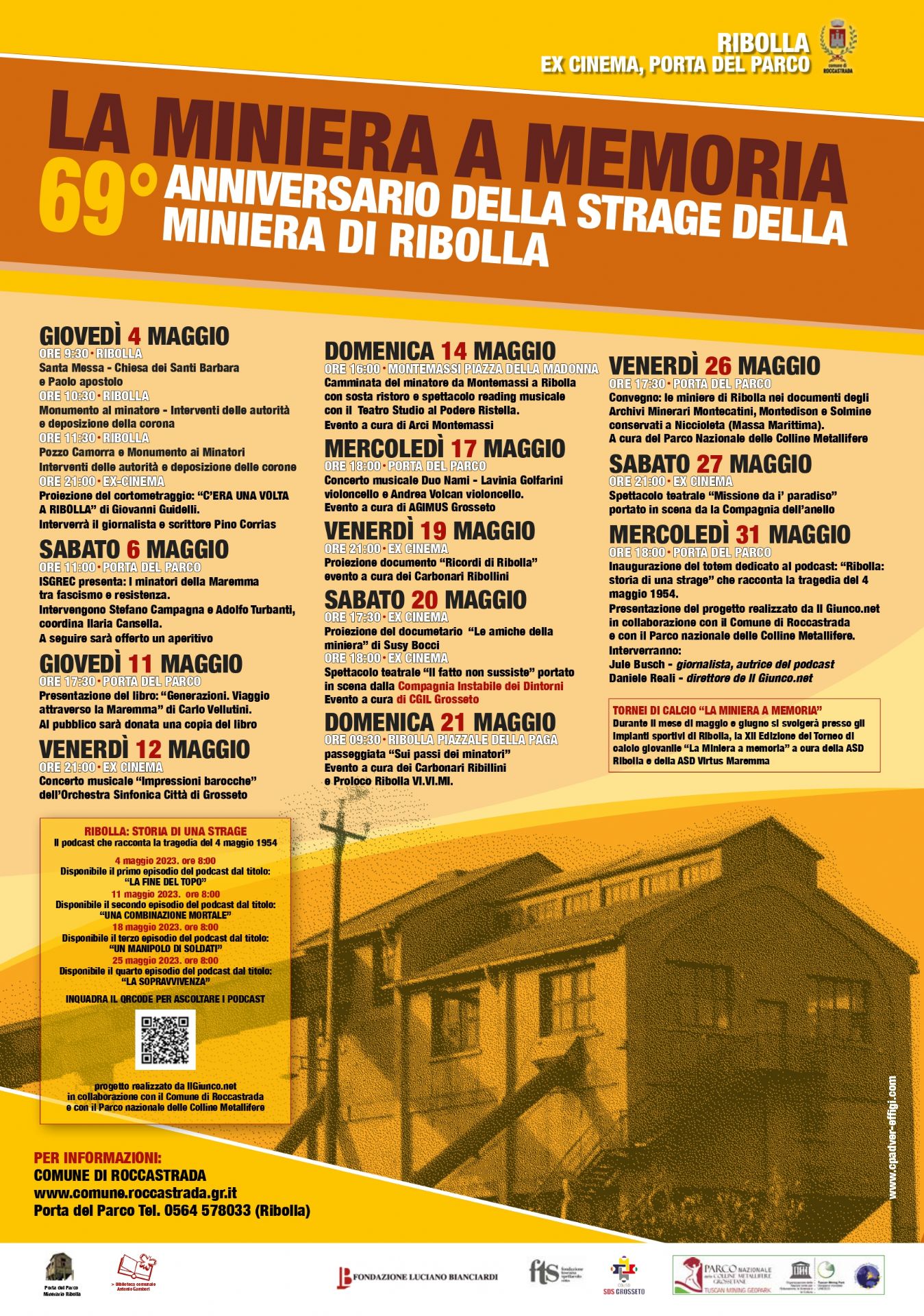 Memoria storica e sociale e cultura tornano a unirsi a Ribolla, nel ricordo del 69esimo anniversario della strage mineraria di Ribolla del 4 maggio 1954 costata la vita a 43 minatori. Gli appuntamenti con il cartellone ‘La miniera a memoria’ si apriranno giovedi 4 e andranno avanti fino a mercoledi 31 maggio, promossi dal Comune di Roccastrada in collaborazione con Coeso SdS, Parco Tecnologico Archeologico delle Colline Metallifere Grossetane, Fondazione Bianciardi, Fondazione toscana Spettacolo e numerose associazioni locali.