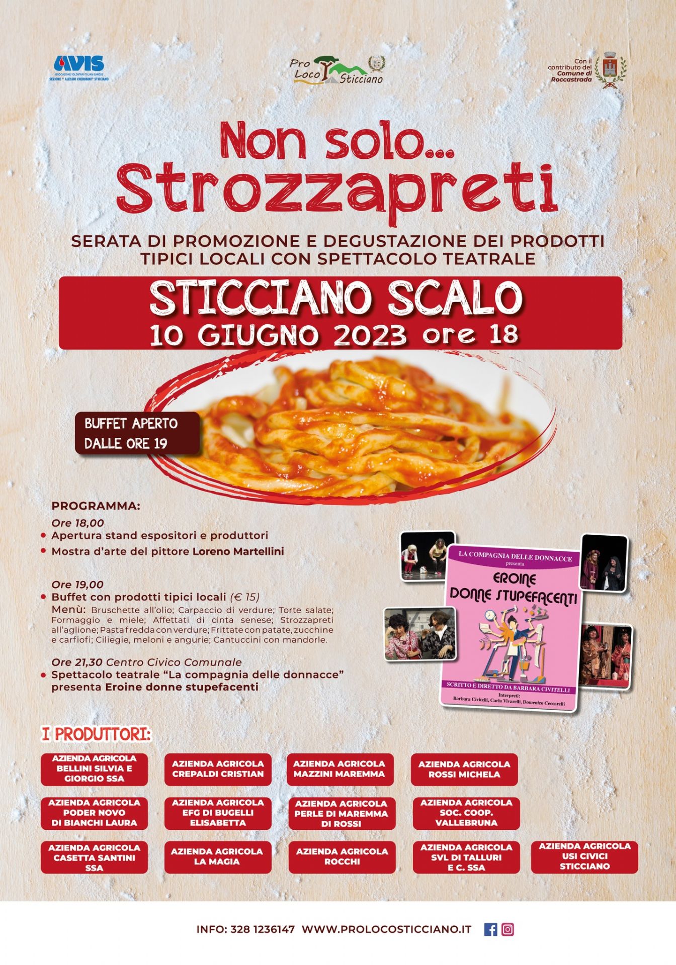 Sabato 10 giugno a Sticciano Scalo “Non solo…Strozzapreti” una serata di promozione e degustazione dei prodotti tipici locali con spettacolo teatrale.