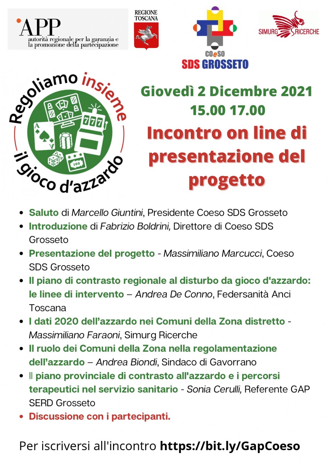 CoeSo SdS Grosseto ha fissato un incontro di presentazione del progetto “Regoliamo insieme l'azzardo”, previsto in modalità online per giovedì 2 dicembre alle ore 15.