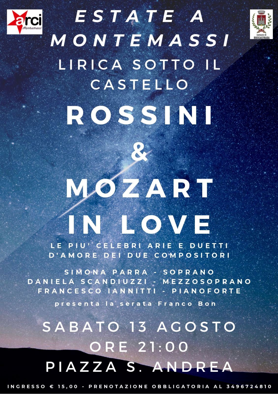 Sabato 13 agosto alle ore 21.00 il cartellone "Estate a Montemassi" per la lirica sotto il castello presenta "Rossini e Mozart in love", le più celebri aree e duetti d'amore dei due compositori.