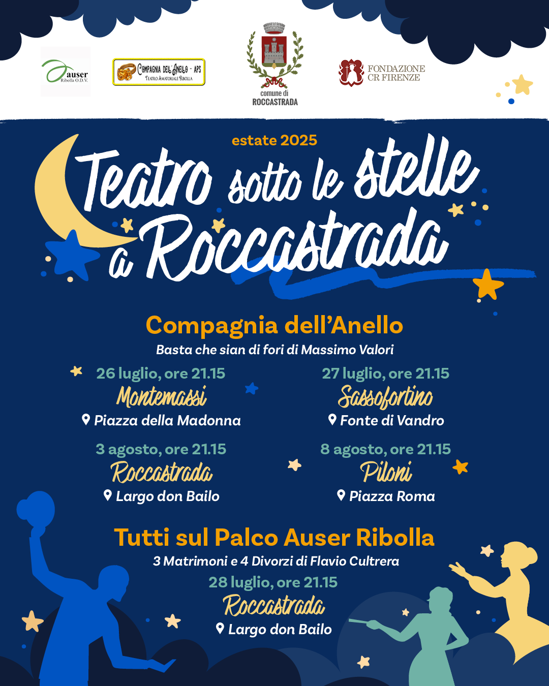 La “Compagnia dell’Anello” metterà in scena la commedia “Basta che sian di fòri” sabato 26 luglio in Piazza della Madonna a Montemassi, domenica 27 luglio al Parco comunale Fonte di Vandro a Sassofortino, domenica 3 agosto in piazzale Don Bailo a Roccastrada e venerdi 8 agosto in piazza Roma a Piloni, mentre la compagnia “Tutti sul palco AUSER Ribolla” con la commedia “3 matrimoni e 4 divorzi” sarà in scena in Largo Don Bailo a Roccastrada lunedi 28 luglio.