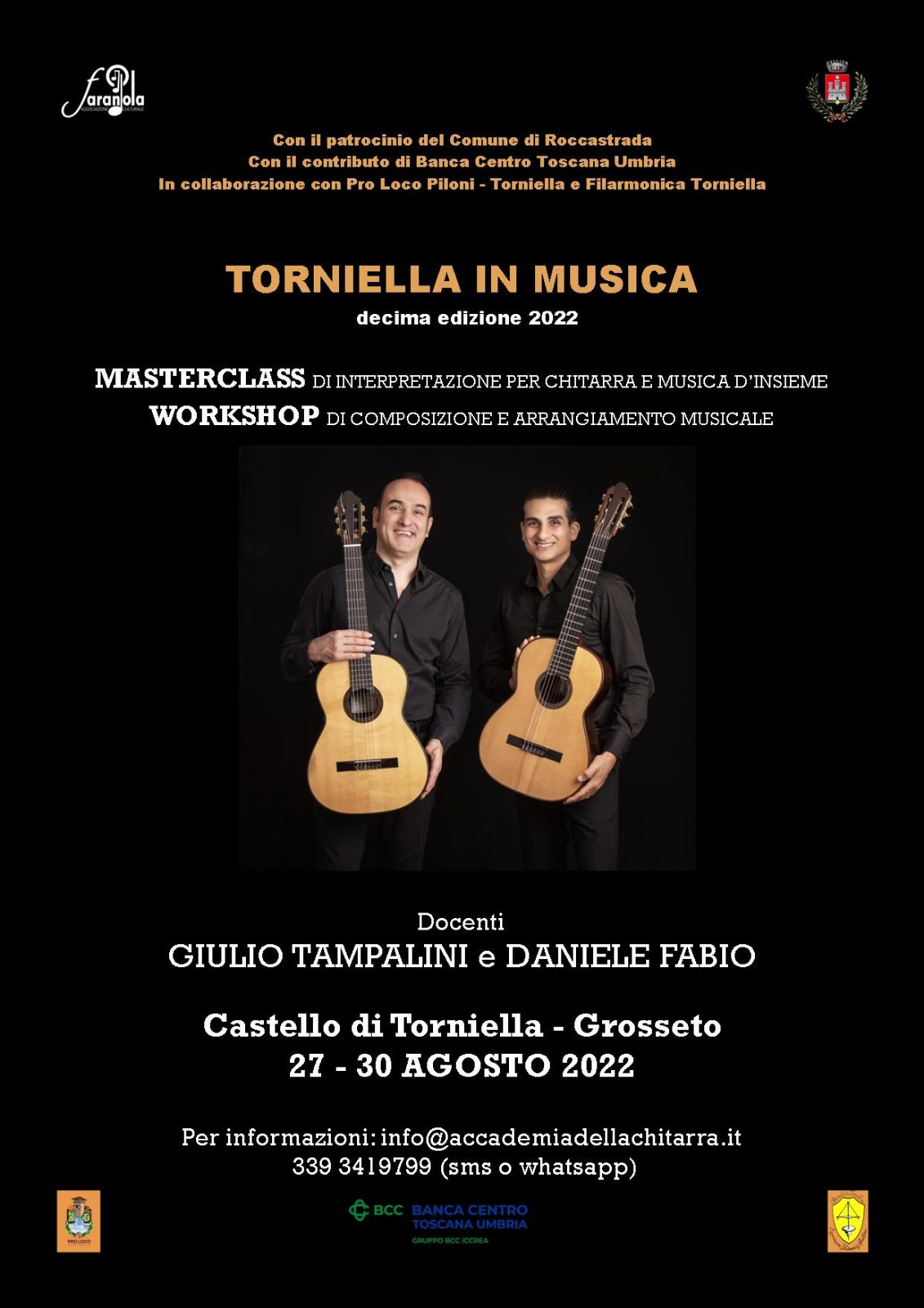 L’edizione 2022 di “Torniella in Musica” si concluderà con una masterclass di interpretazione per chitarra e musica d’insieme ed un workshop di composizione ed arrangiamento musicale dal 27 al 30 agosto a cura dei docenti Giulio Tampalini e Daniele Fabio che chiuderanno con un concerto la sera del 27 agosto.