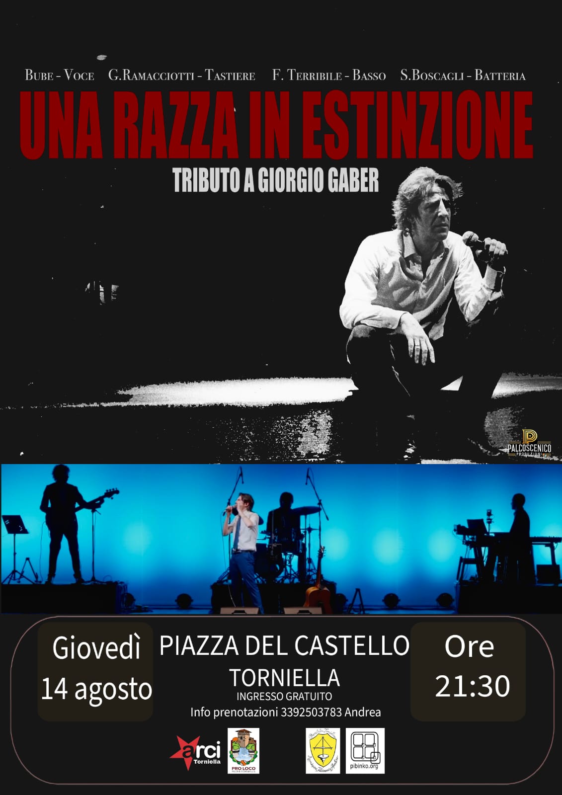 Giovedi 14 agosto in piazza del Castello a Torniella alle ore 21.30 concerto tributo a Giorgio Gaber "Una razza in estinzione".