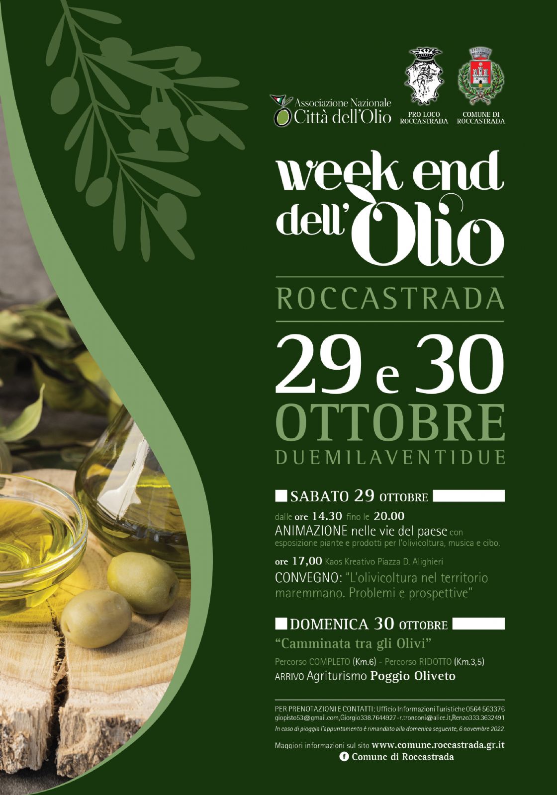 Si inizia Sabato 29 dalle ore 14,30 con l’animazione nelle vie del paese con esposizione piante e prodotti per l’olivicoltura. Alle 17,00 al Kaos Kreativo Convegno: “L’olivicoltura nel territorio maremmano. Problemi e prospettive” con la partecipazione dell’assessora Elena Menghini, del Vice Presidente Associazione Nazionale Città dell’Olio Marcello Bonechi, del Direttore della CIA di Grosseto, Enrico Rabazzi, della Direttrice della Coldiretti Grosseto Milena Sanna, del Vice Presidente Regionale del Consorzio Tutela dell’Olio IGP, Giampiero Cresti, del Responsabile Commerciale dell’Azienda BioDea di Arezzo, Duilio Melegari e del Sindaco di Roccastrada e Presidente della Provincia di Grosseto, Francesco Limatola.