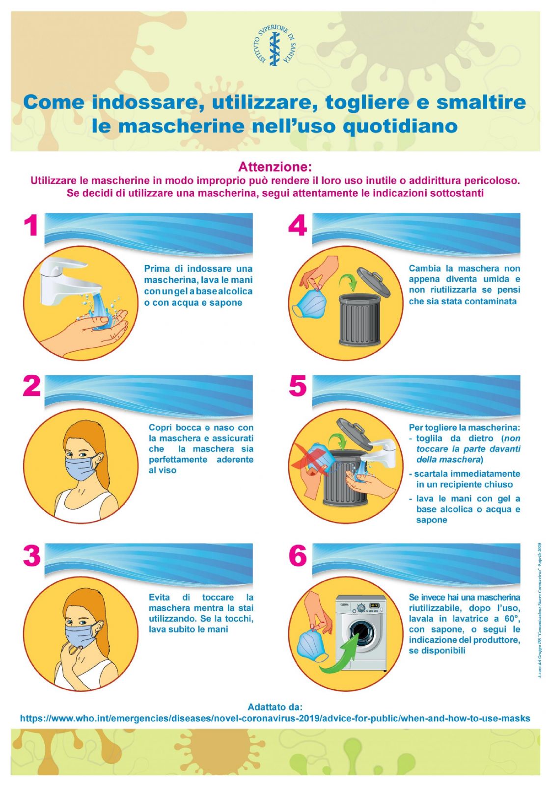 Un breve schema illustrativo, redatto a cura del Gruppo Istituto Superiore Sanità, al fine di sensibilizzare la popolazione su come indossare, utilizzare, togliere e smaltire le mascherine.