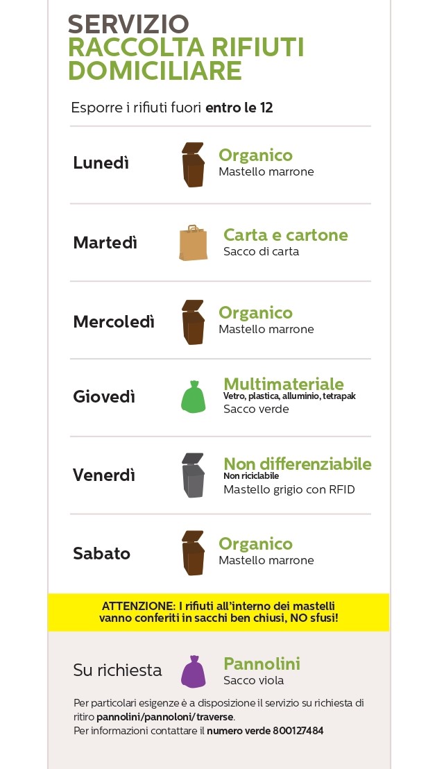 Nei paesi dove è attiva la raccolta, verranno rimosse dai centri abitati le campane stradali per la raccolta multi materiale pesante (vetro, plastica, alluminio e tetrapack), passando ad un servizio con sacchetto porta a porta di colore verde. Inoltre i rifiuti non riciclabili dovranno essere raccolti in sacchi ben chiusi ed esposti all’esterno in un mastello, caratterizzato da un sistema di riconoscimento dell’utenza.
