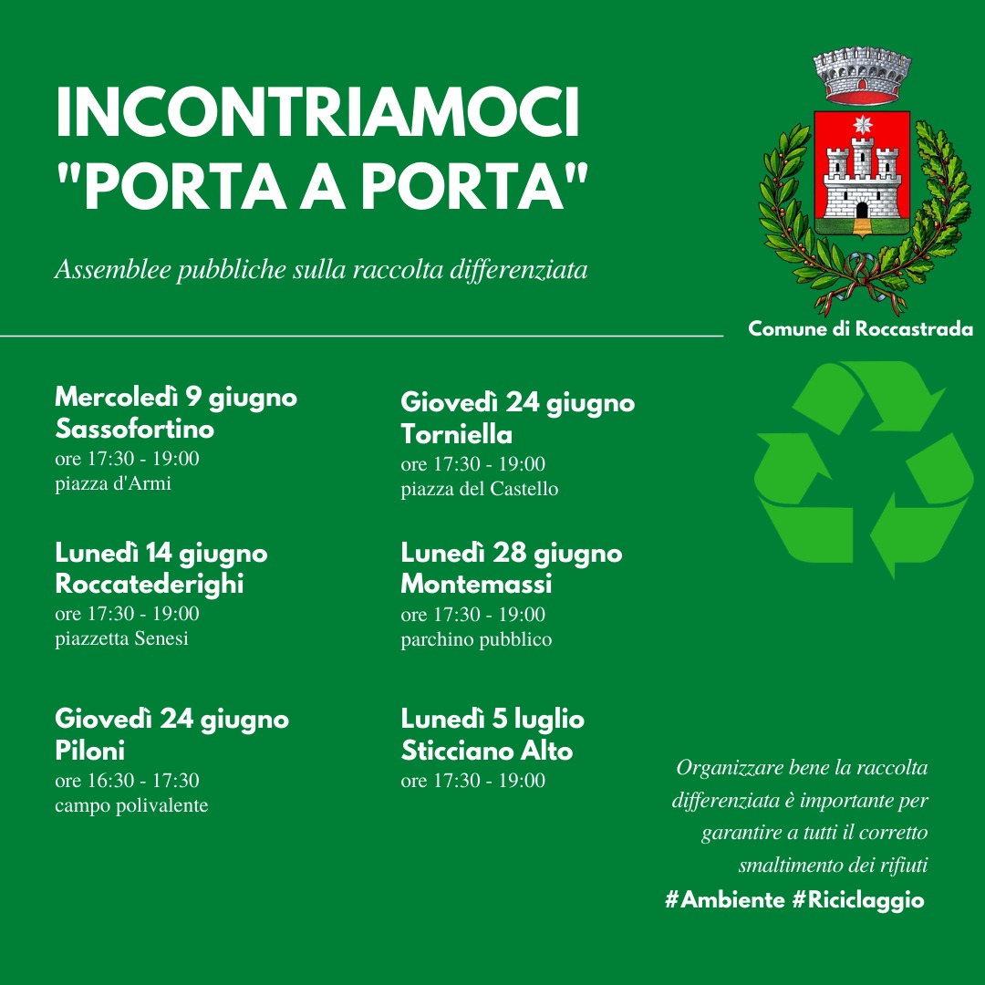 “Incontriamoci porta a porta”, è questo il titolo del ciclo di assemblee pubbliche sulla raccolta differenziata nelle quali l’Amministrazione Comunale incontrerà i cittadini di quelle frazioni ove circa 4 mesi fa è iniziata la raccolta domiciliare, per fare il punto della situazione ed ascoltare eventuali suggerimenti che possono derivare dal colloquio con coloro che sono stati recentemente coinvolti con il nuovo metodo di raccolta.