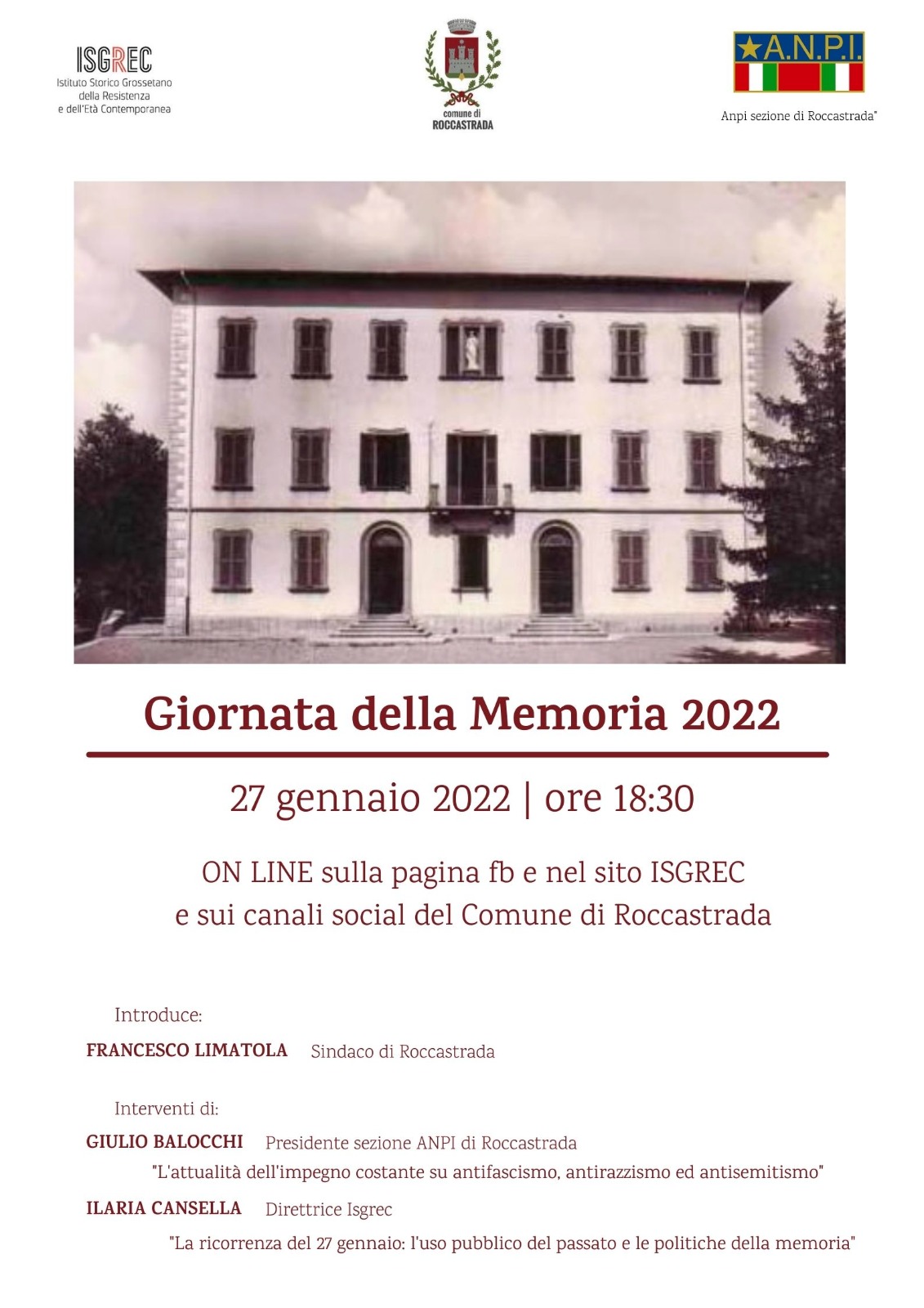 In occasione della Giornata della Memoria, quest’anno il Comune di Roccastrada, l’Anpi di Roccastrada e l’Istituto storico grossetano della Resistenza e dell’Età contemporanea (Isgrec) celebrano la ricorrenza del 27 gennaio, data dell’abbattimento dei cancelli del campo di Auschwitz da parte dell’Armata Rossa, con un incontro che sarà trasmesso online sulle pagine Facebook e sui siti del Comune di Roccastrada e dell’Isgrec alle ore 18.30.