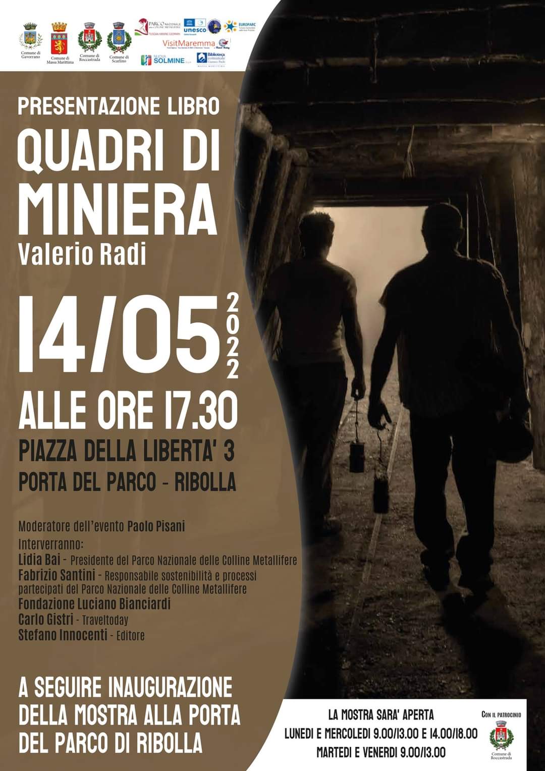 Informazioni. Il cartellone “La miniera a memoria” è promosso dal Comune di Roccastrada in collaborazione con Coeso SdS, Parco Nazionale delle Colline Metallifere Grossetane, Fondazione Bianciardi, Fondazione Toscana Spettacolo e numerose associazioni locali. Il programma completo è disponibile sul sito del Comune, www.comune.roccastrada.gr.it e per ulteriori informazioni è possibile contattare la Porta del Parco di Ribolla al numero 0564-578033.