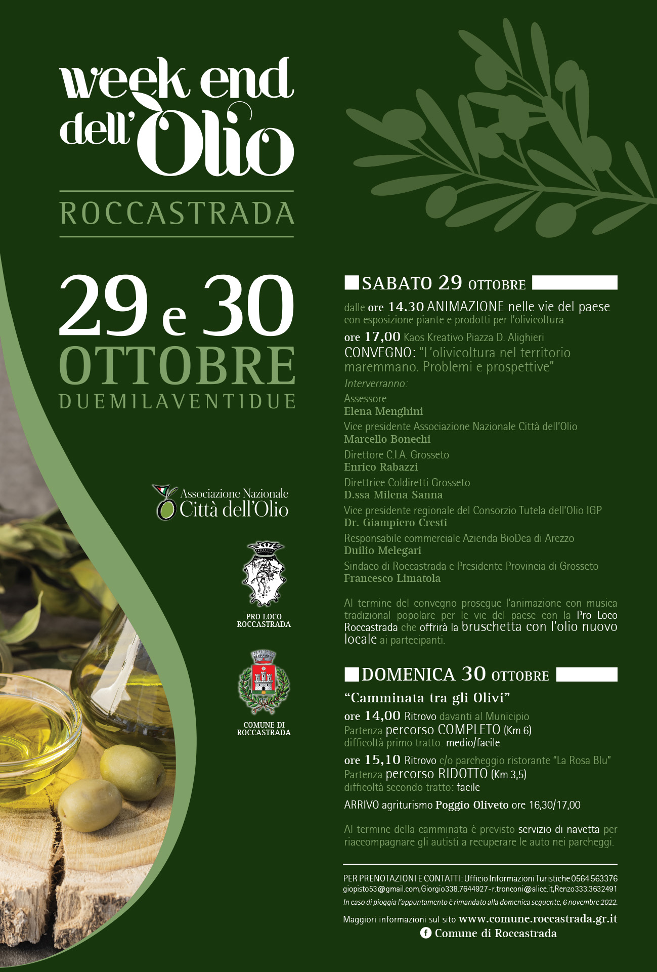 Si inizia Sabato 29 dalle ore 14,30 con l’animazione nelle vie del paese con esposizione piante e prodotti per l’olivicoltura. Alle 17,00 al Kaos Kreativo Convegno: “L’olivicoltura nel territorio maremmano. Problemi e prospettive” con la partecipazione dell’assessora Elena Menghini, del Vice Presidente Associazione Nazionale Città dell’Olio Marcello Bonechi, del Direttore della CIA di Grosseto, Enrico Rabazzi, della Direttrice della Coldiretti Grosseto Milena Sanna, del Vice Presidente Regionale del Consorzio Tutela dell’Olio IGP, Giampiero Cresti, del Responsabile Commerciale dell’Azienda BioDea di Arezzo, Duilio Melegari e del Sindaco di Roccastrada e Presidente della Provincia di Grosseto, Francesco Limatola.