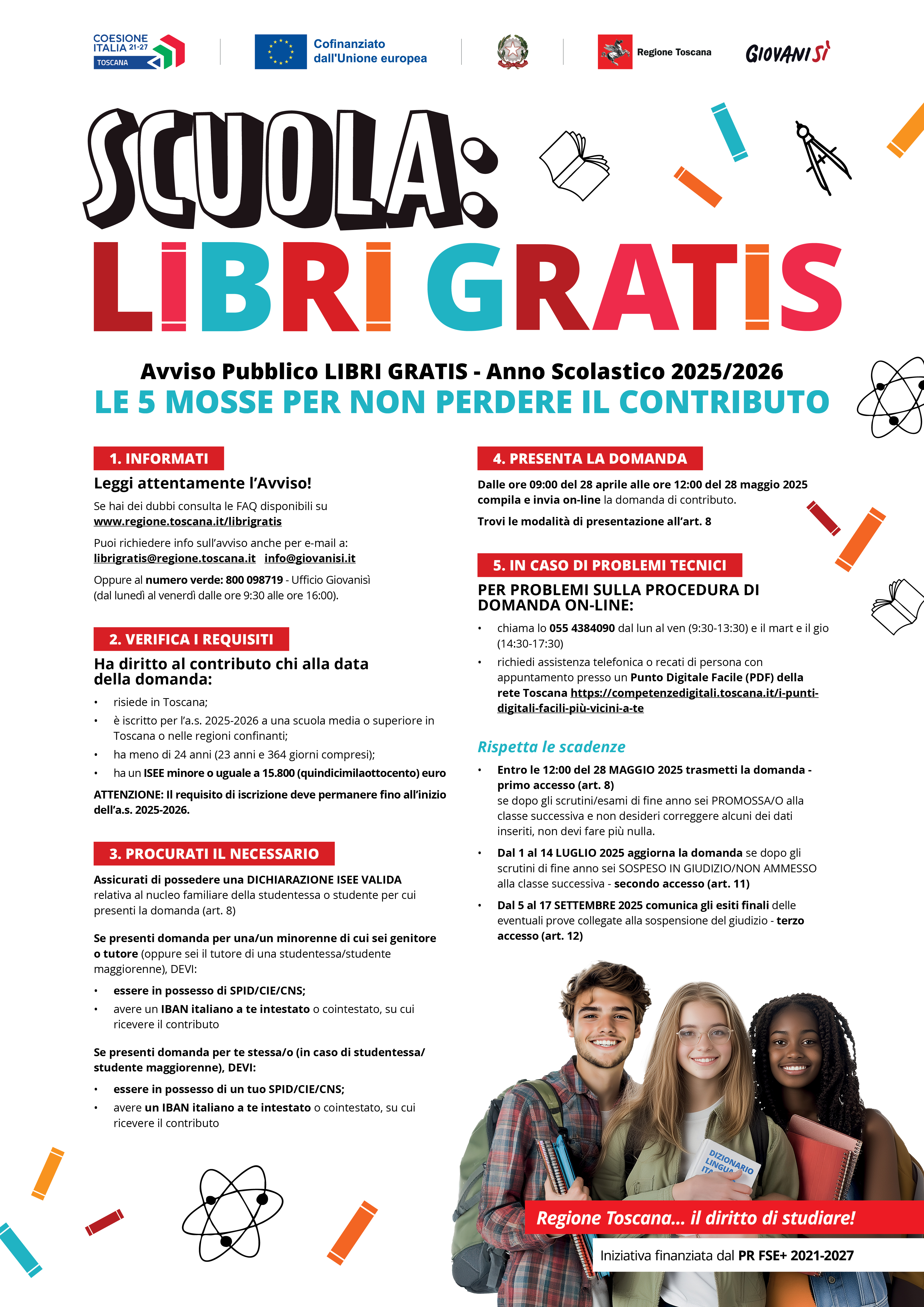 Regione Toscana, nell’ambito di Giovanisì, ha approvato il bando di Libri Gratis, un intervento a sostegno delle famiglie e delle studentesse e studenti nel loro percorso scolastico.