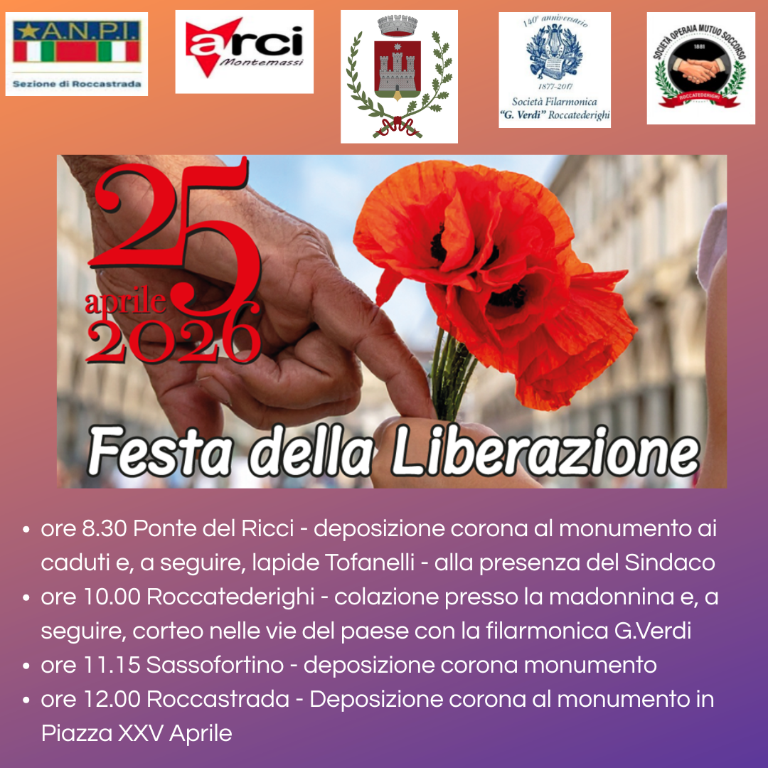 Il Comune di Roccastrada, nel ribadire ed affermare l’importanza di questo anniversario, conferma i tradizionali appuntamenti che prevedono per venerdi 25 aprile, la deposizione delle corone di alloro ed altri momenti celebrativi.