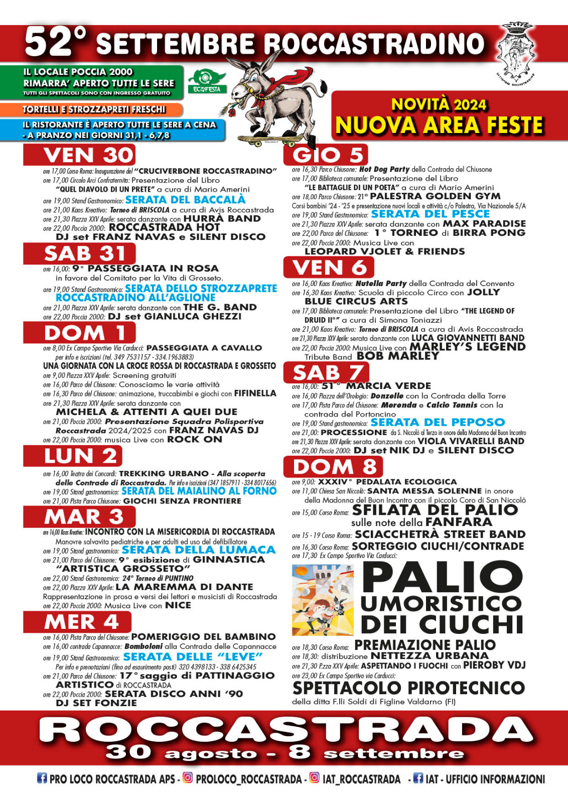 Roccastrada si prepara ad accogliere la 52esima edizione del Settembre Roccastradino con dieci giorni di tradizioni, sport, sapori tipici e animazione da venerdì 30 agosto a domenica 8 settembre, giorno del gran finale con il “Palio umoristico dei ciuchi” che anche quest’anno si svolgerà nella cornice dell’ex campo sportivo di Via Carducci che farà da palcoscenico anche all'evento di chiusura dei festeggiamenti, il tradizionale spettacolo pirotecnico.