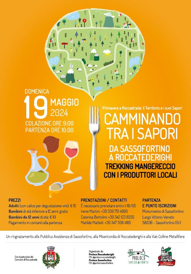L’evento di Domenica 19 maggio dal titolo “Camminando tra i Sapori”, prevede un percorso di trekking di circa 6 km adatto a tutti, partendo dal Monumento di Sassofortino fino ad arrivare nel Centro Storico di Roccatederighi, passando per boschi suggestivi con panorami mozzafiato. E’ consigliato abbigliamento adeguato ad un trekking (scarpe chiuse e vestiti sportivi). Durante il sentiero saranno presenti aziende del territorio che faranno degustare i loro prodotti.