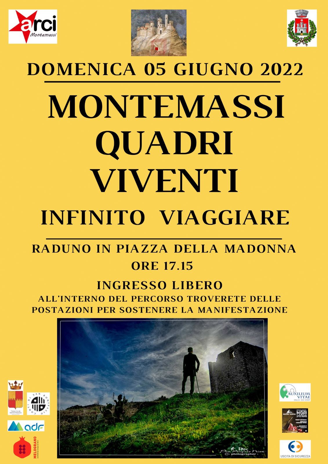 Domenica 5 giugno il paese tornerà ad essere un museo a cielo aperto, dando vita a decine di quadri, tra le piazze, le vie, gli scorci e i panorami di Montemassi. Si terrà infatti la 6° edizione del tradizionale appuntamento con I Quadri Viventi dal titolo “INFINITO VIAGGIARE”, uno spettacolo unico che vede impegnati circa cento persone tra figuranti, carpentieri, falegnami, elettricisti, costumisti, parrucchieri, truccatori, appassionati di arti figurative, e tanti altri che daranno vita a stupendi allestimenti scenografici.