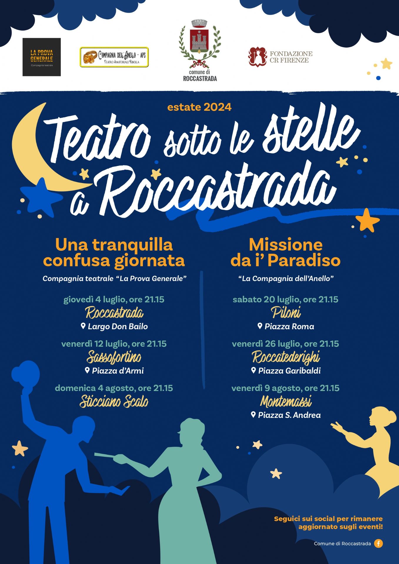 Con l’organizzazione del Comune di Roccastrada ed il contributo di Fondazione CR Firenze, le due compagnie teatrali amatoriali “La prova generale” e “Compagnia dell’Anello” metteranno in scena rispettivamente, la prima “Una tranquilla confusa giornata” giovedi 4 luglio in Largo Don Bailo a Roccastrada, venerdi 12 luglio in Piazza D’Armi a Sassofortino e domenica 4 agosto in Via dei Mille a Sticciano Scalo, mentre la seconda “Missione da i’ paradiso” sabato 20 luglio in Piazza Roma a Piloni, venerdi 26 luglio in Piazza Garibaldi a Roccatederighi e venerdi 9 agosto in Piazza S.Andrea a Montemassi. Gli spettacoli ad ingresso libero e gratuito, avranno inizio alle ore 21,15.