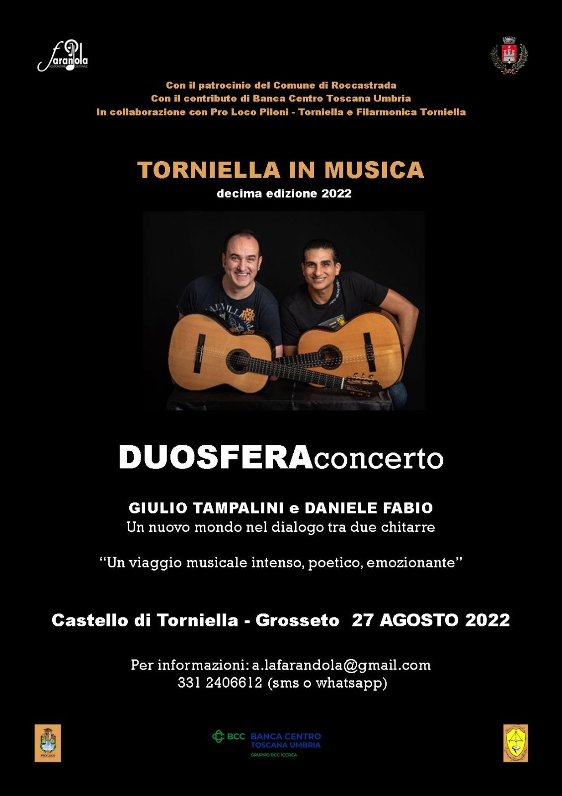 L’edizione 2022 di “Torniella in Musica” si concluderà con una masterclass di interpretazione per chitarra e musica d’insieme ed un workshop di composizione ed arrangiamento musicale dal 27 al 30 agosto a cura dei docenti Giulio Tampalini e Daniele Fabio che chiuderanno con un concerto la sera del 27 agosto.