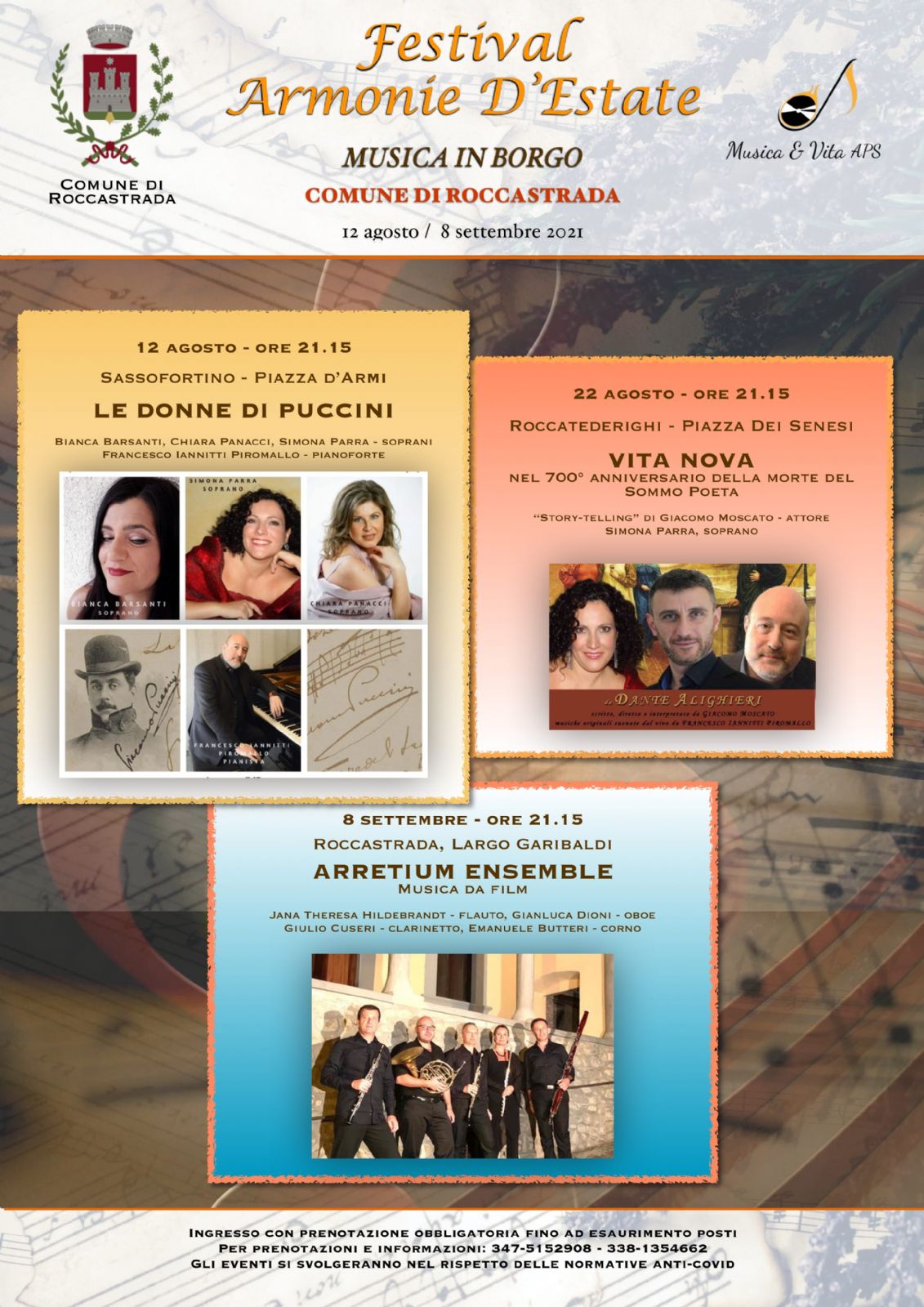Il Comune di Roccastrada, in collaborazione con l’Associazione “Musica & Vita Aps” è lieto di presentare il festival “Armonie D’Estate”, tre serate musicali, sotto la direzione artistica del maestro Francesco Iannitti Piromallo ed il soprano Simona Parra, che vedono protagonista la grande musica e la grande poesia del sommo poeta. Gli eventi animeranno le piazze dei borghi di Sassofortino, Roccatederighi e Roccastrada.