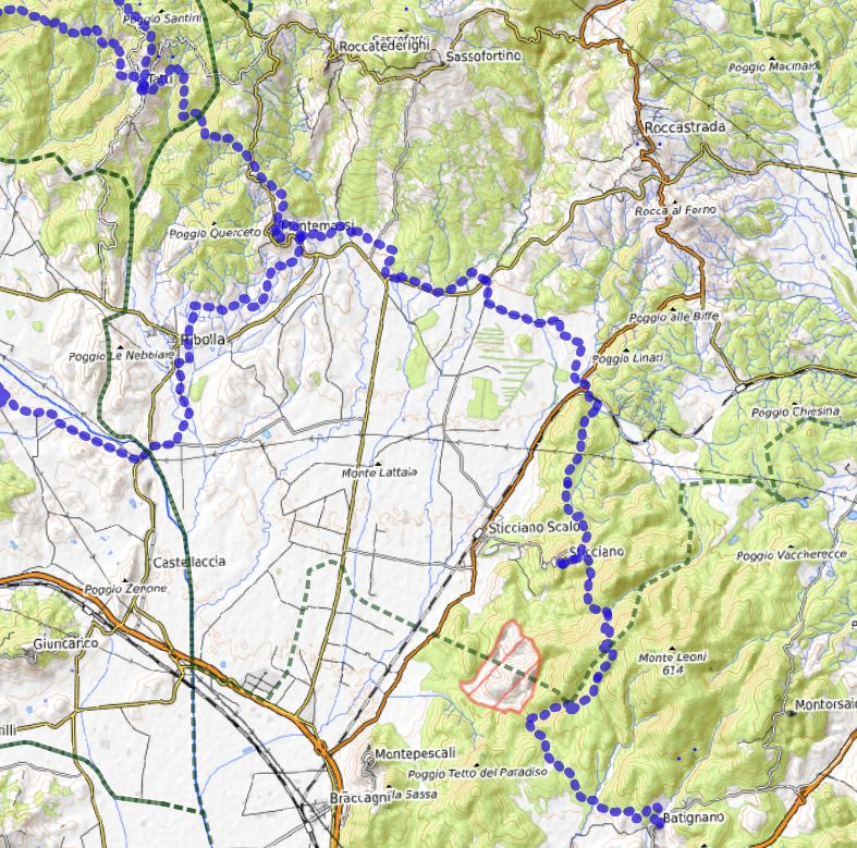 Dalla mappa allegata è possibile vedere la porzione di percorso che interessa il territorio di Roccastrada.