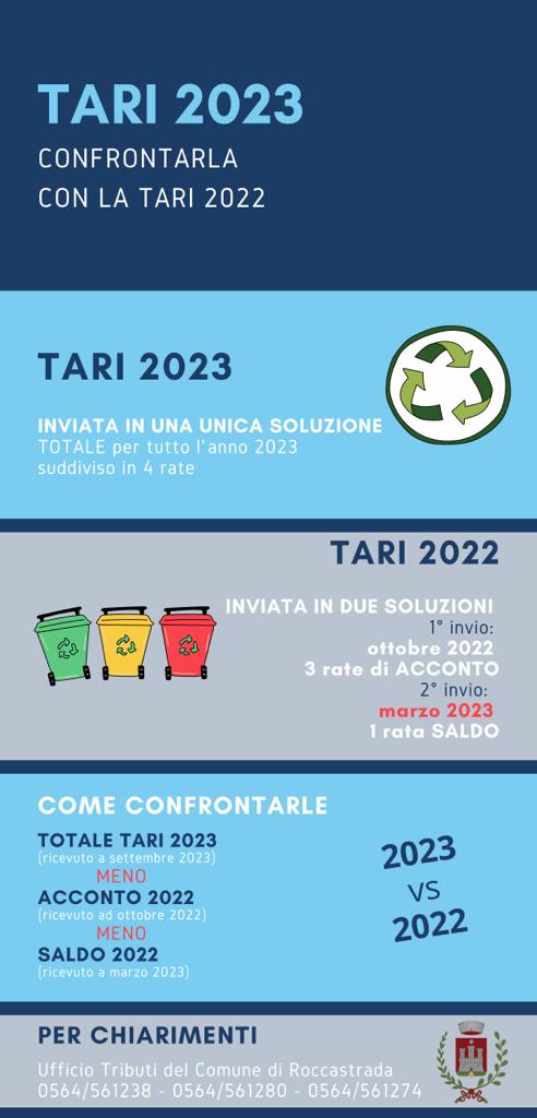 In questi giorni stanno arrivando nelle case le bollette TARI Anno 2023: si precisa che diversamente dagli anni scorsi, per quest'anno sono state inviate in unica soluzione tutte e 4 le rate, compresa la rata di saldo. Negli anni scorsi, in una prima fase, venivano inviate 3 rate di acconto e la rata di saldo l'anno successivo.