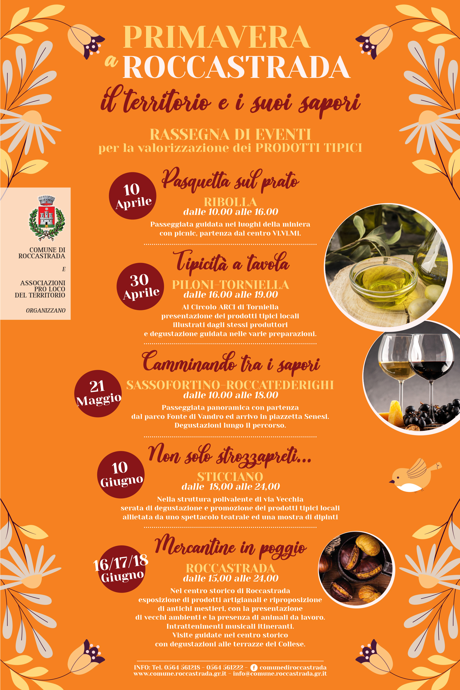 Con l’arrivo della primavera, a Roccastrada riprende la campagna di promozione del territorio e dei suoi prodotti tipici. E’ stata questa l’idea messa in campo dall’Amministrazione Comunale che, attraverso un percorso condiviso ed un processo partecipativo che ha coinvolto le sei Associazioni Pro Loco presenti sul territorio, ha portato alla programmazione di una serie di eventi distribuiti sul territorio sul tema legato alla promozione dei prodotti tipici.
