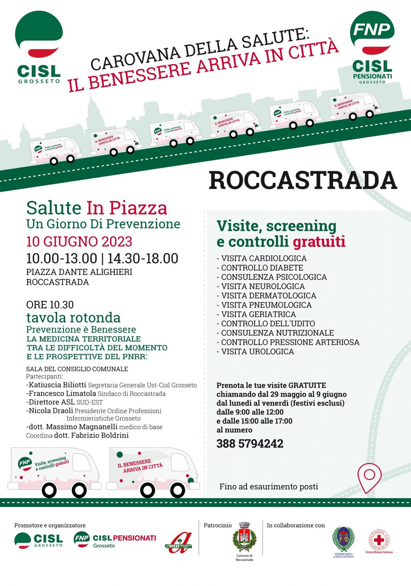 Si chiama “Carovana della salute - il benessere arriva in città” la giornata dedicata interamente alla prevenzione prevista per sabato prossimo, 10 giugno 2023 in piazza Dante Alighieri a Roccastrada. L’evento è organizzato da CISL Grosseto ed FNP CISL Pensionati Grosseto, con il patrocinio del Comune di Roccastrada e la collaborazione della Misericordia di Roccastrada e della Croce Rossa Italiana.